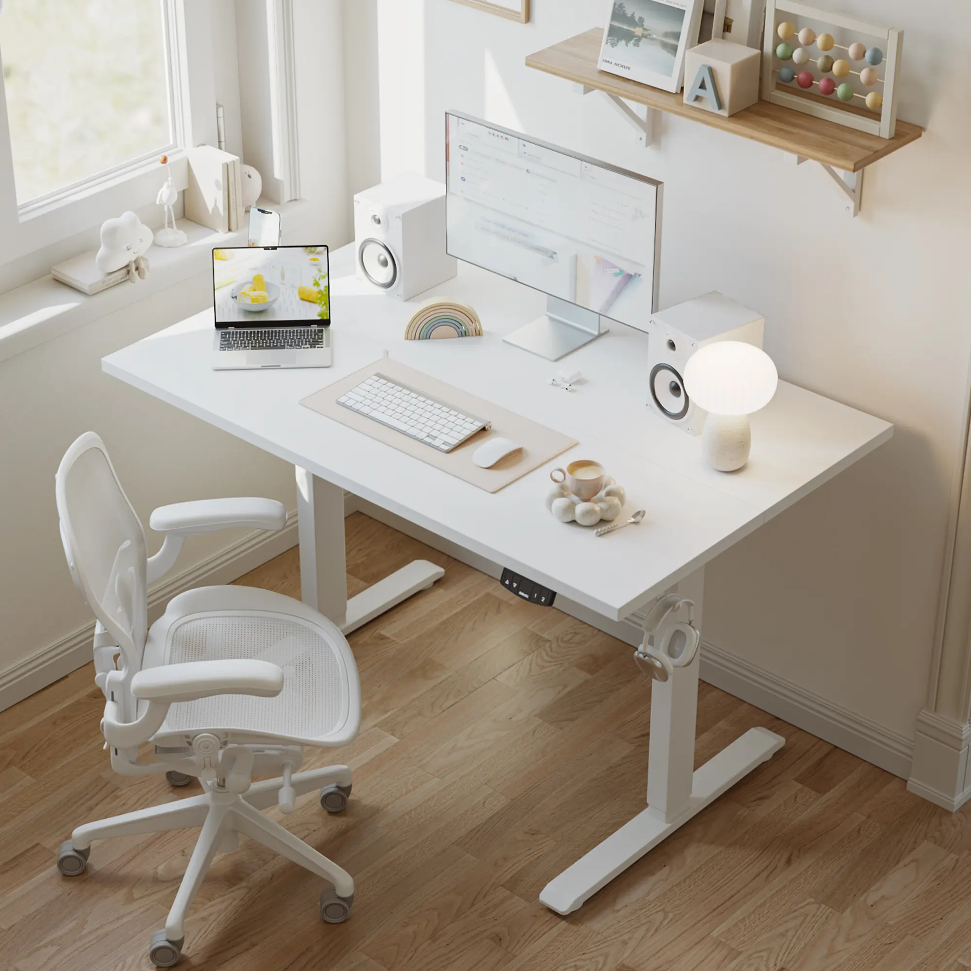 The standing desk provides generous room for your monitor, keyboard, and other work essentials—without taking up too much space. It's a perfect fit for home offices, bedrooms.