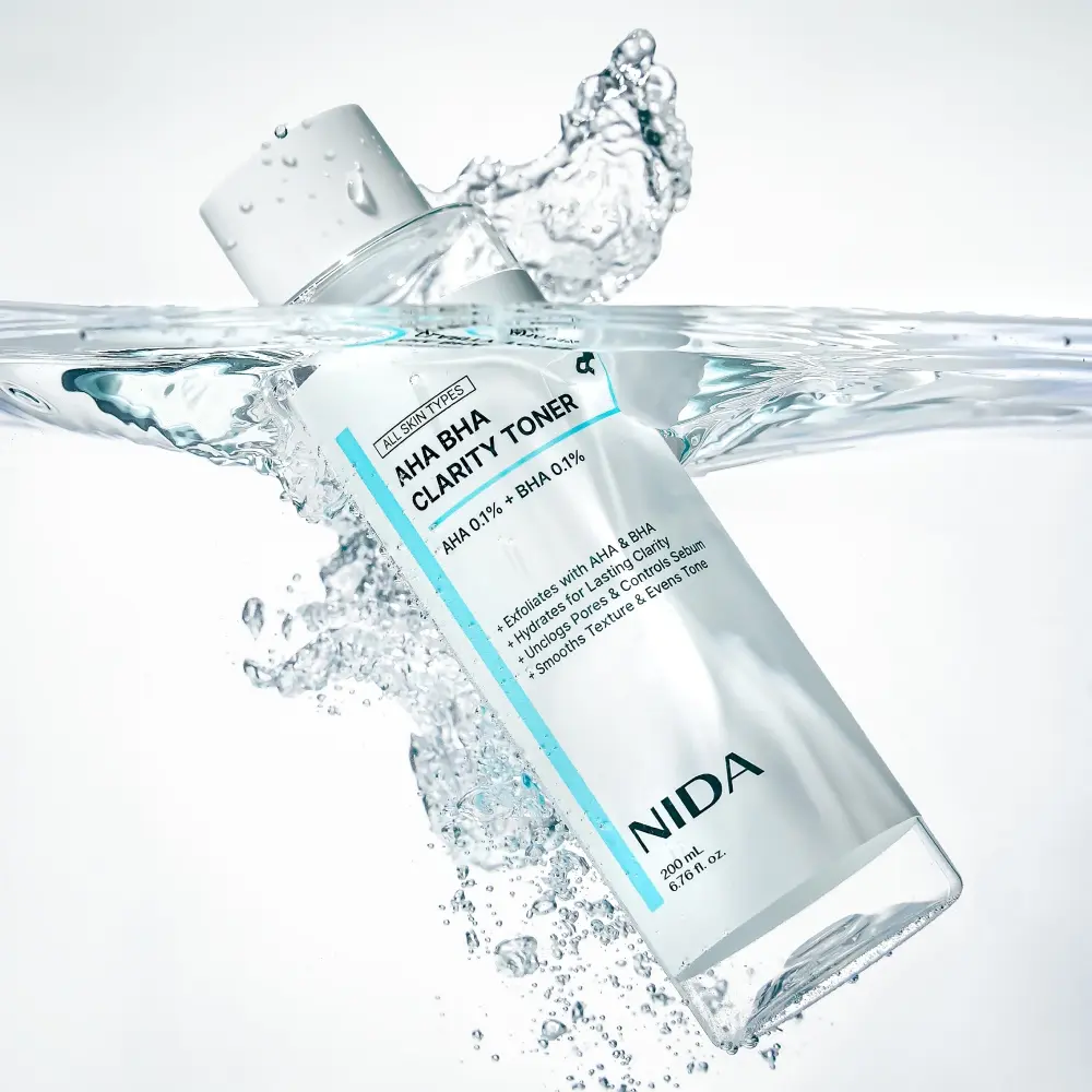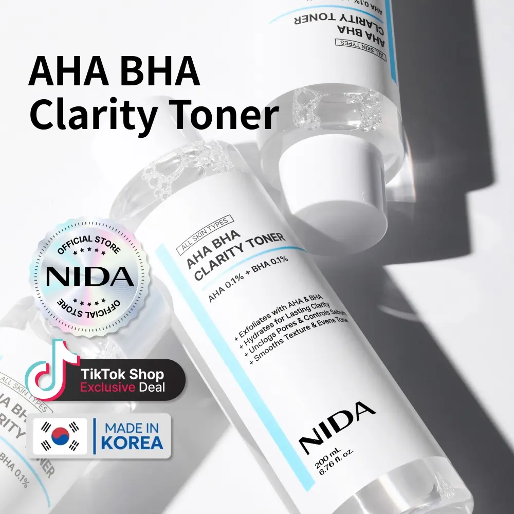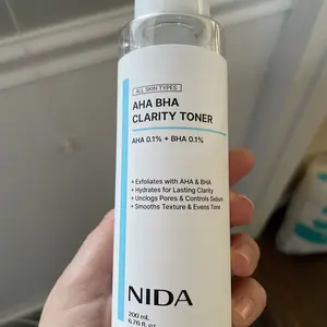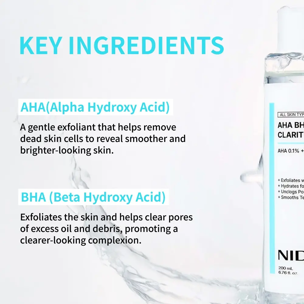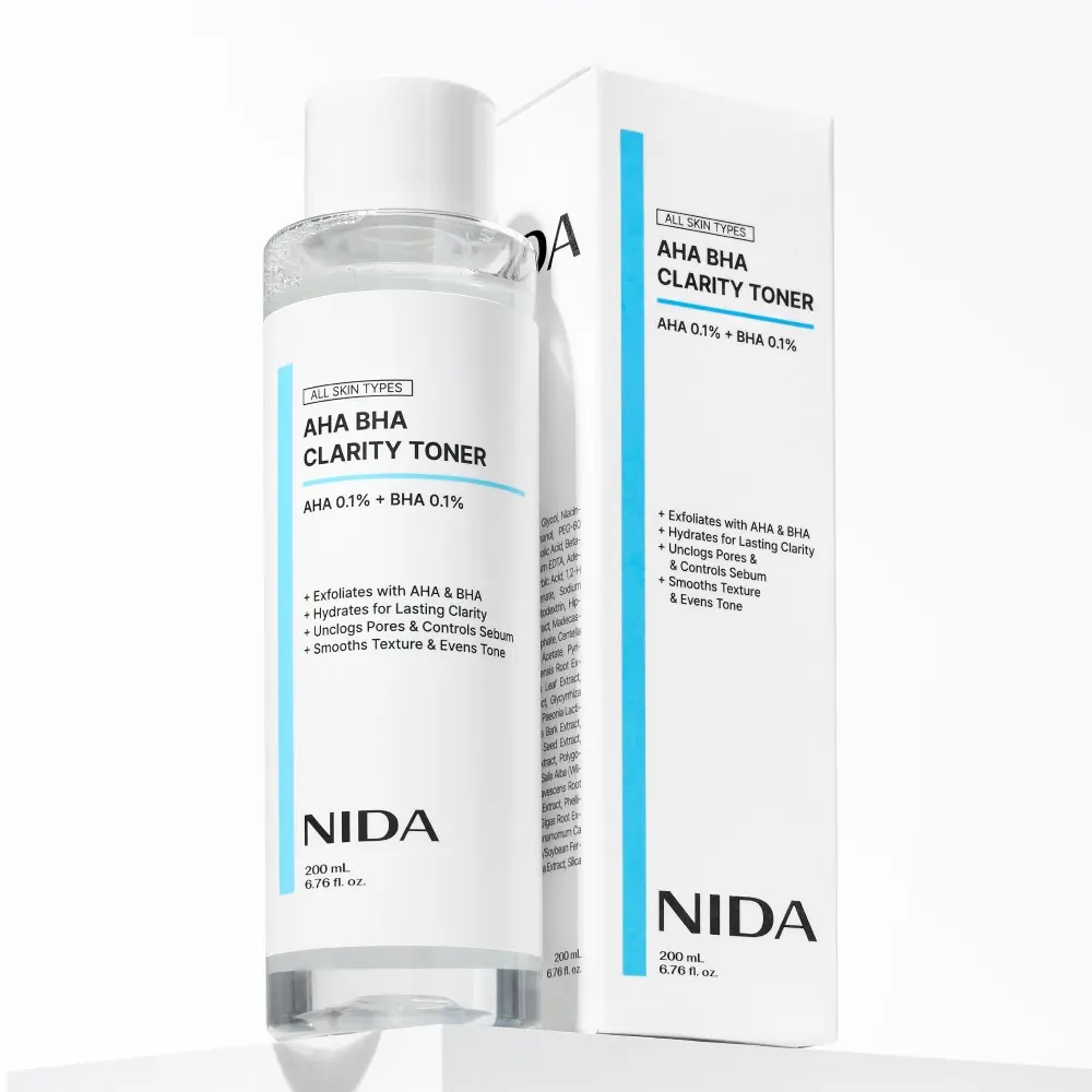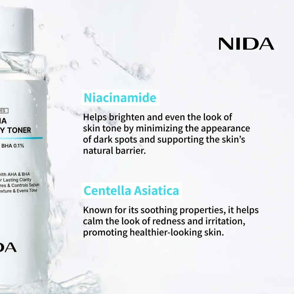NIDA AHA BHA Clarity Toner is a gentle, daily exfoliating toner formulated to help improve skin clarity, texture, and radiance. This toner combines Alpha Hydroxy Acid (AHA) and Beta Hydroxy Acid (BHA) to promote effective exfoliation, helping to remove dead skin cells and unclog pores for a smoother, brighter complexion. Niacinamide supports an even skin tone and strengthens the skin barrier, while a blend of botanical extracts and antioxidants soothes and revitalizes the skin.