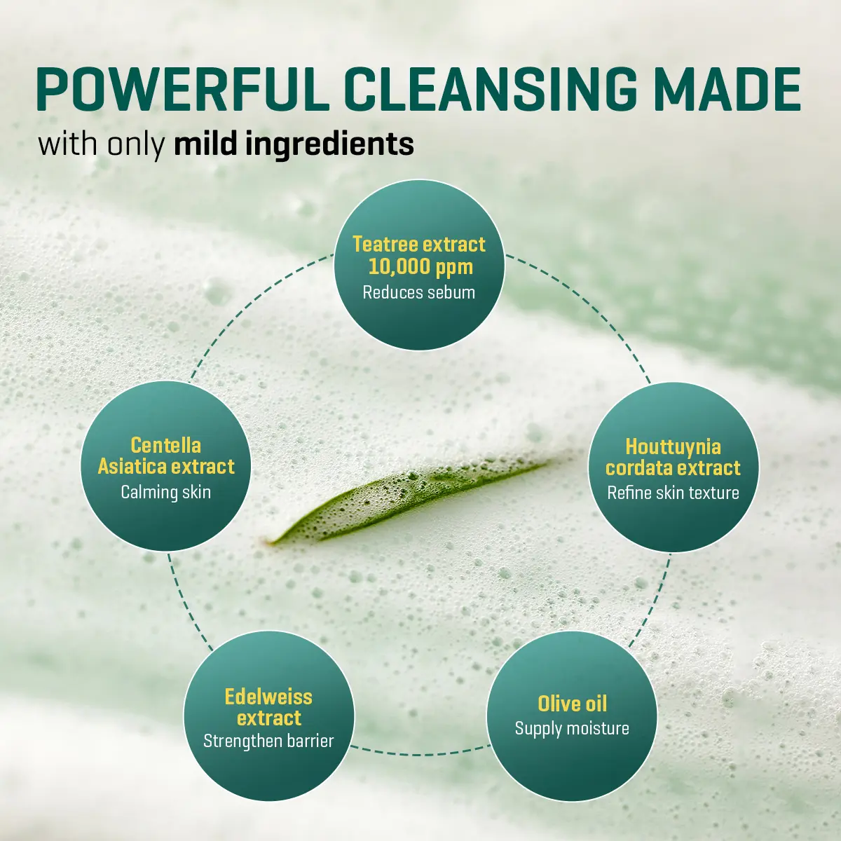 | Ingredients | Glycerin,Water,Propylene Glycol,Sodium Palmitate,Sodium Stearate,Potassium Laurate,Sodium Laurate,Coco-Betaine,Disodium Laureth Sulfosuccinate,Sucrose,Sorbitol,Decyl Glucoside,Niacinamide,Chlorella Vulgaris Powder,Melaleuca Alternifolia (Tea Tree) Leaf Oil,Melaleuca Alternifolia (Tea Tree) Extract,Stearic Acid,Citric Acid(5,000 ppm),Salicylic Acid(5,Hordeum Vulgare Leaf Powder,Houttuynia Cordata Extract,Glycyrrhiza Uralensis (Licorice) Root Extract,Leontopodium alpinum Extract,Olea Europaea (Olive) Fruit Oil,Argania Spinosa Kernel Oil,Camellia Sinensis Seed Oil,Adansonia Digitata Seed Extract,Centella Asiatica Extract,Lactobionic Acid(1,Hydrolyzed Potato Protein,Hydrolyzed Wheat Protein,Hydrolyzed Rice Protein,Hydrolyzed Oat Protein,Disodium EDTA,Limonene |