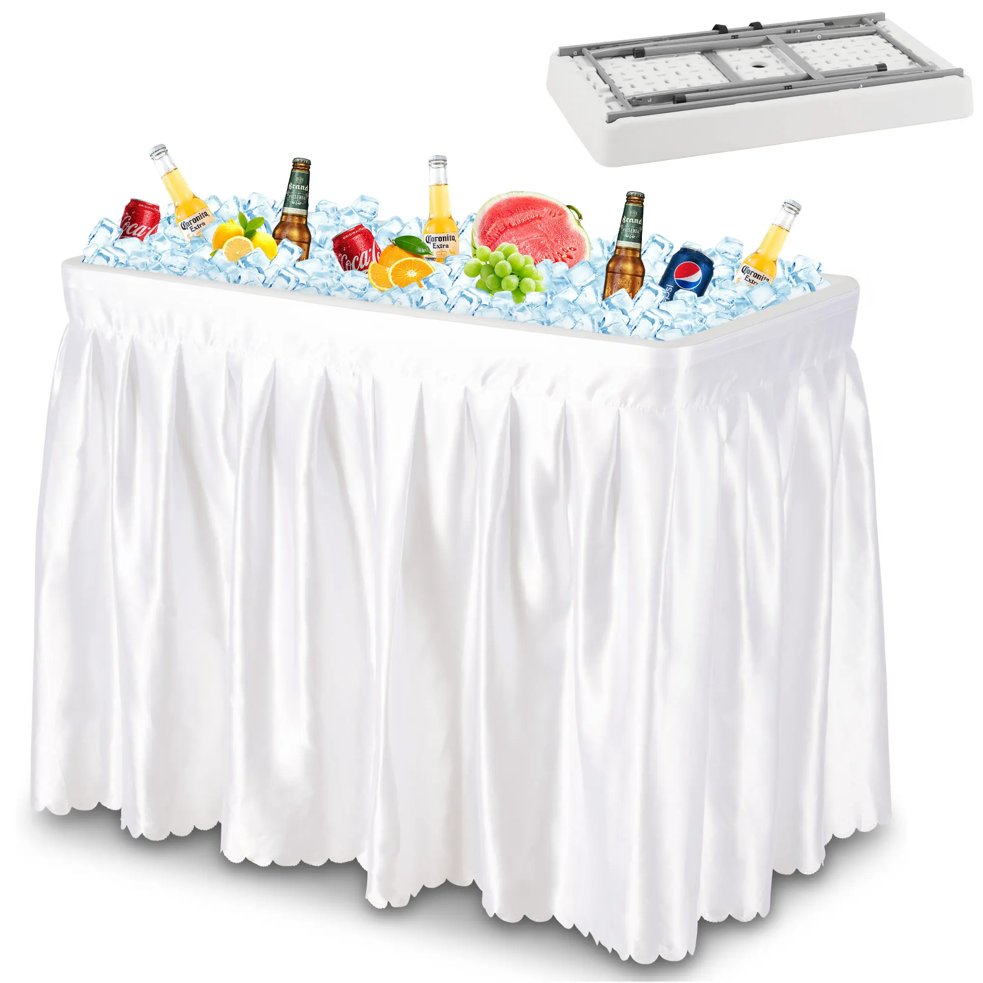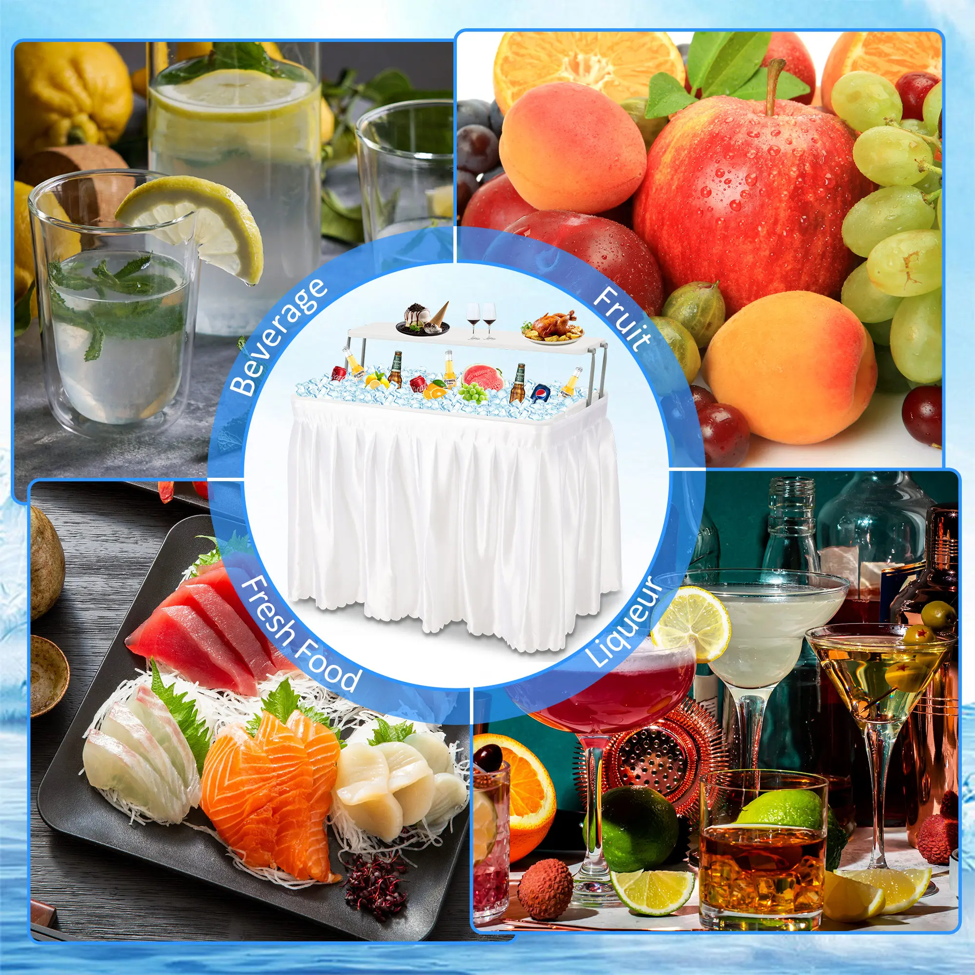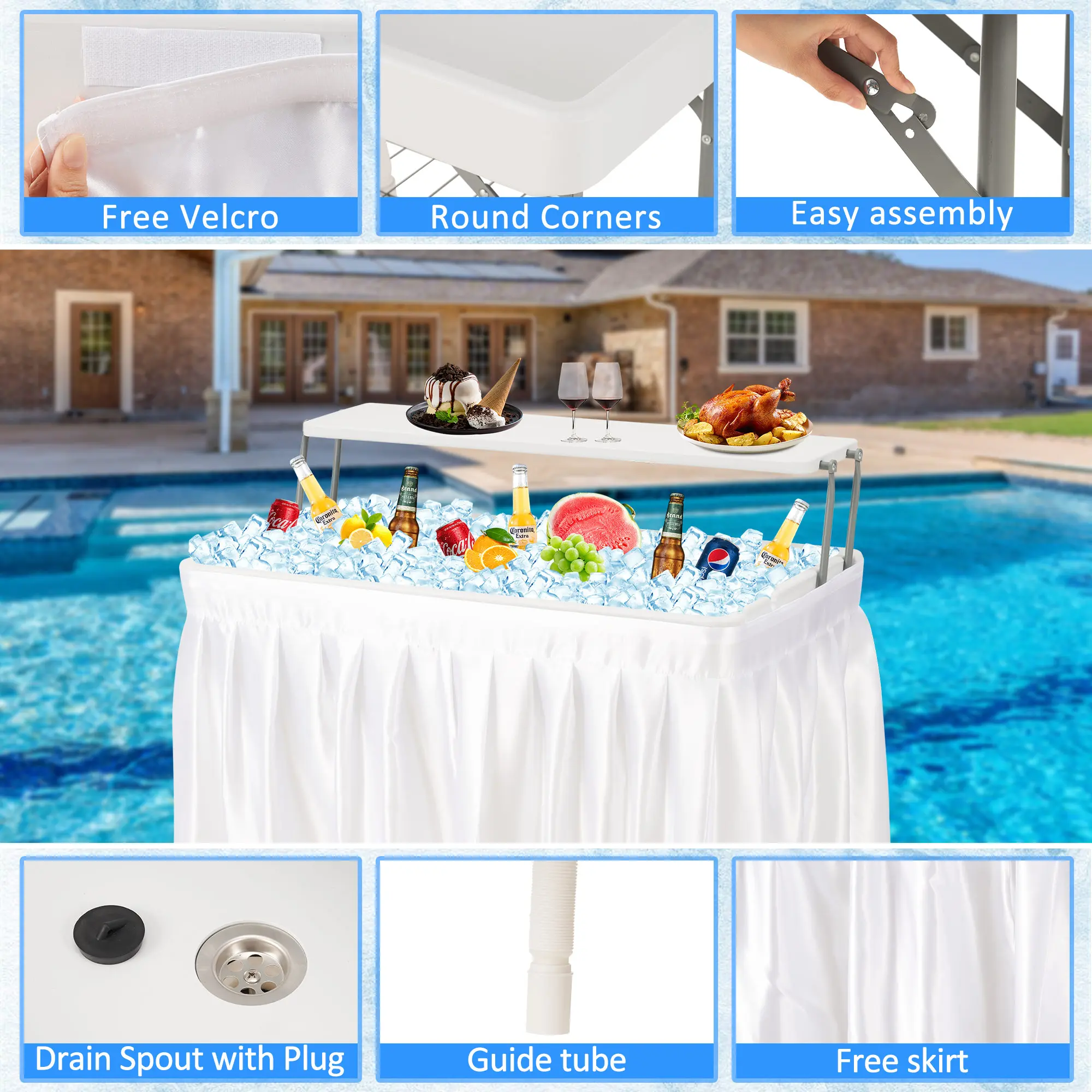 ·REMOVABLE SKIRT AND METAL HOLDER: The Drink Cooler Table comes with a skirt and velcro fasteners, and the faux satin sheen adds an elegant and classy vibe to your party. The metal shelf adds extra storage space and can be hidden under the skirt.
