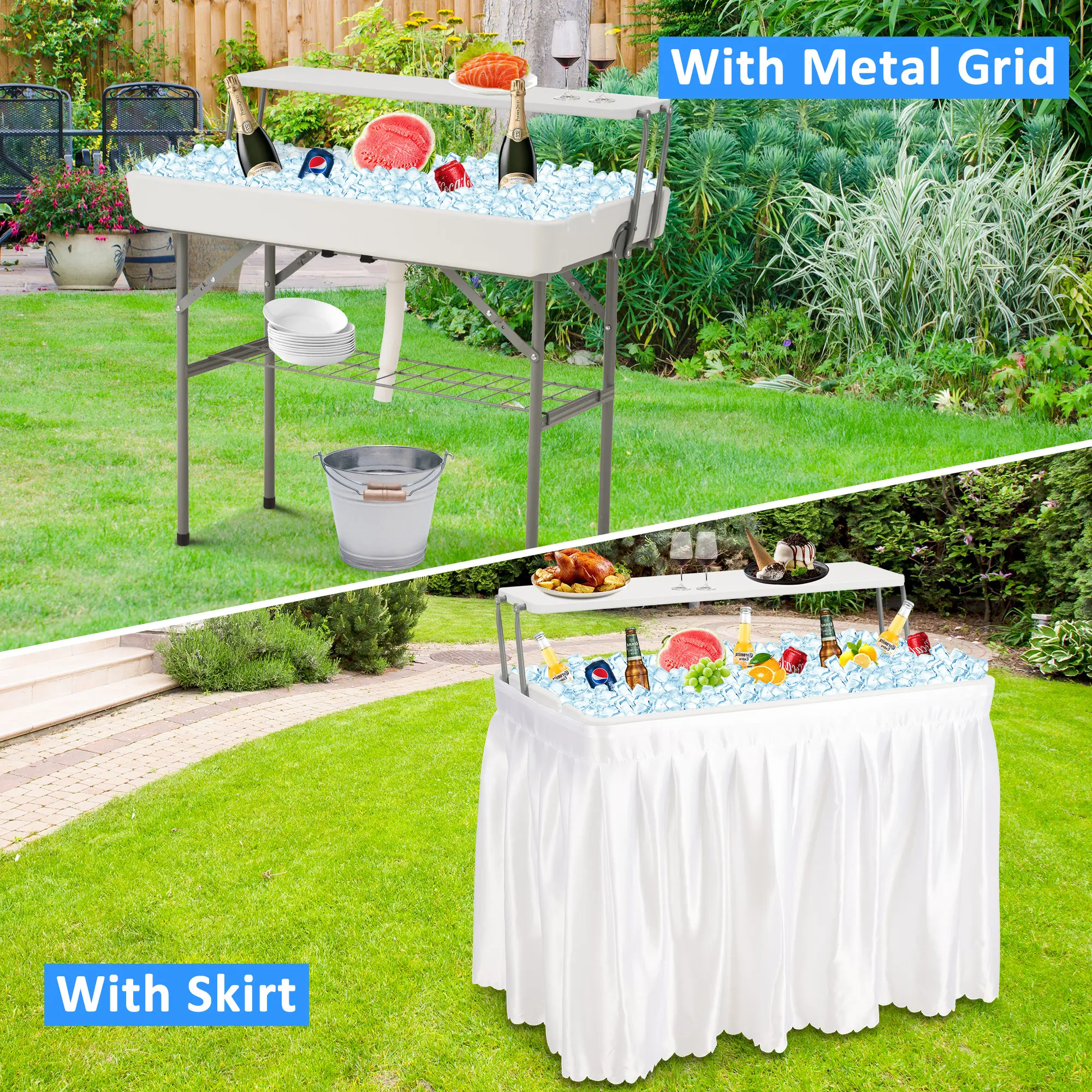 ·FOLDING PORTABLE: This 4 Ft Ice Cooler Table folds with stainless steel rigid legs that lock into place and won't pop open during transportation, and a carry handle for easy landing.