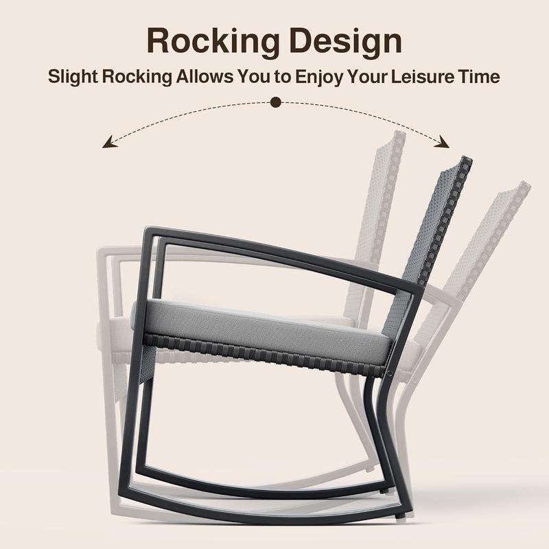 ·Comfortable Rocking Design : The patio furniture set with optimize ergonomic seat and armrests to reduce knee flexion. The 3 inch thick cushions are flexible to give you extra comfort. Add rocking feature to rock yourself into a state of relaxation