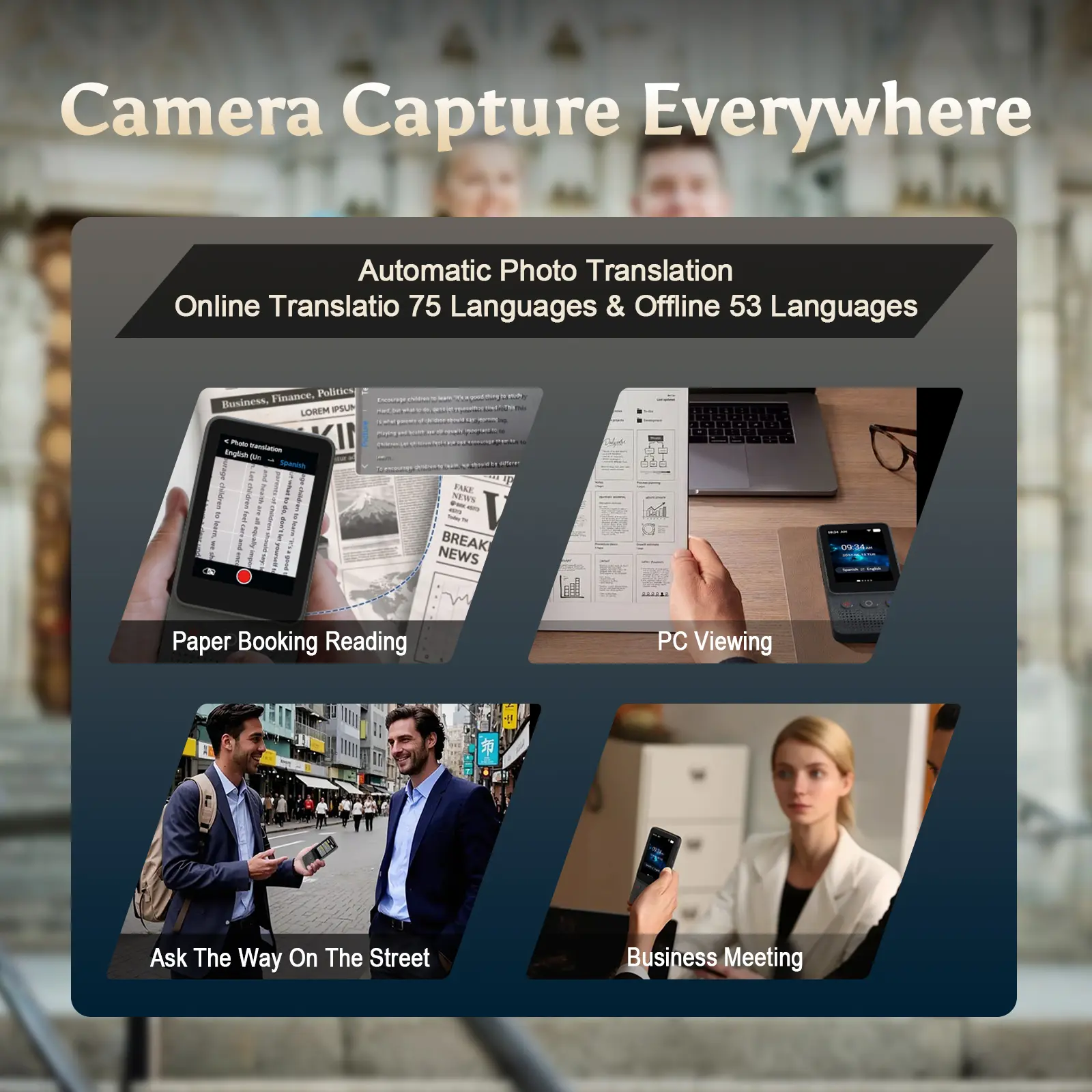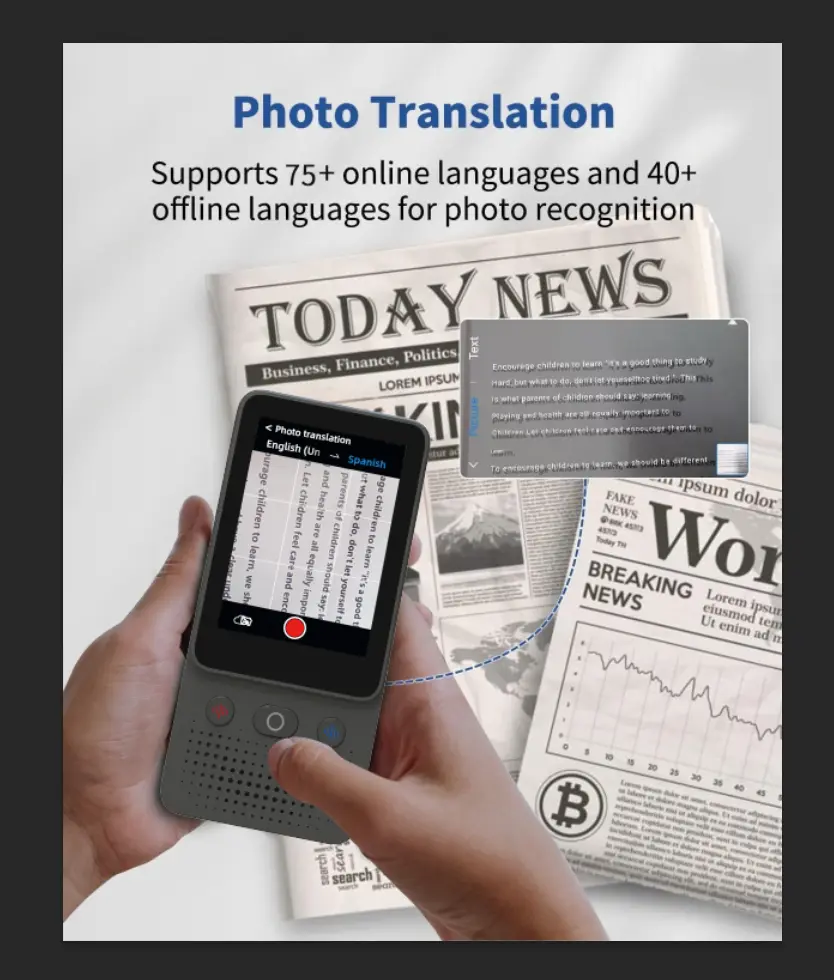 The device allows photo translation, where you can take pictures of text (menus, signs, documents) and have them translated instantly. It also supports offline translation by downloading language packs, making it perfect for remote areas with no internet access.