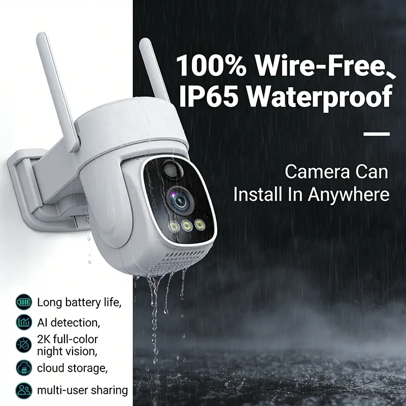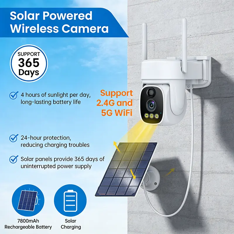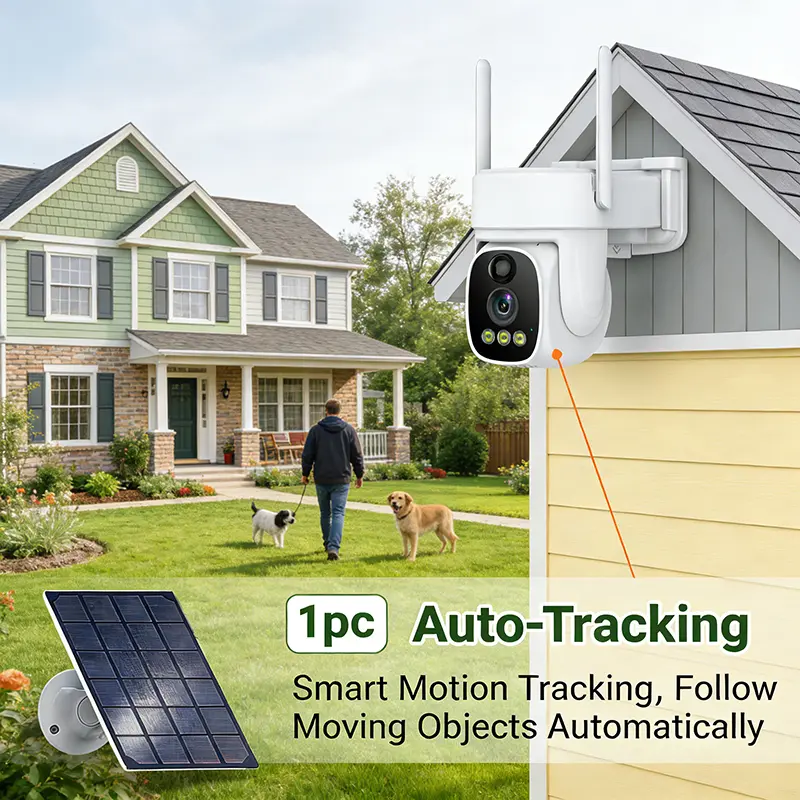 AI motion detection security camera, wireless solar-powered, two-way communication, automatic tracking, color night vision, spotlight alarm, cloud storage and SD card storage