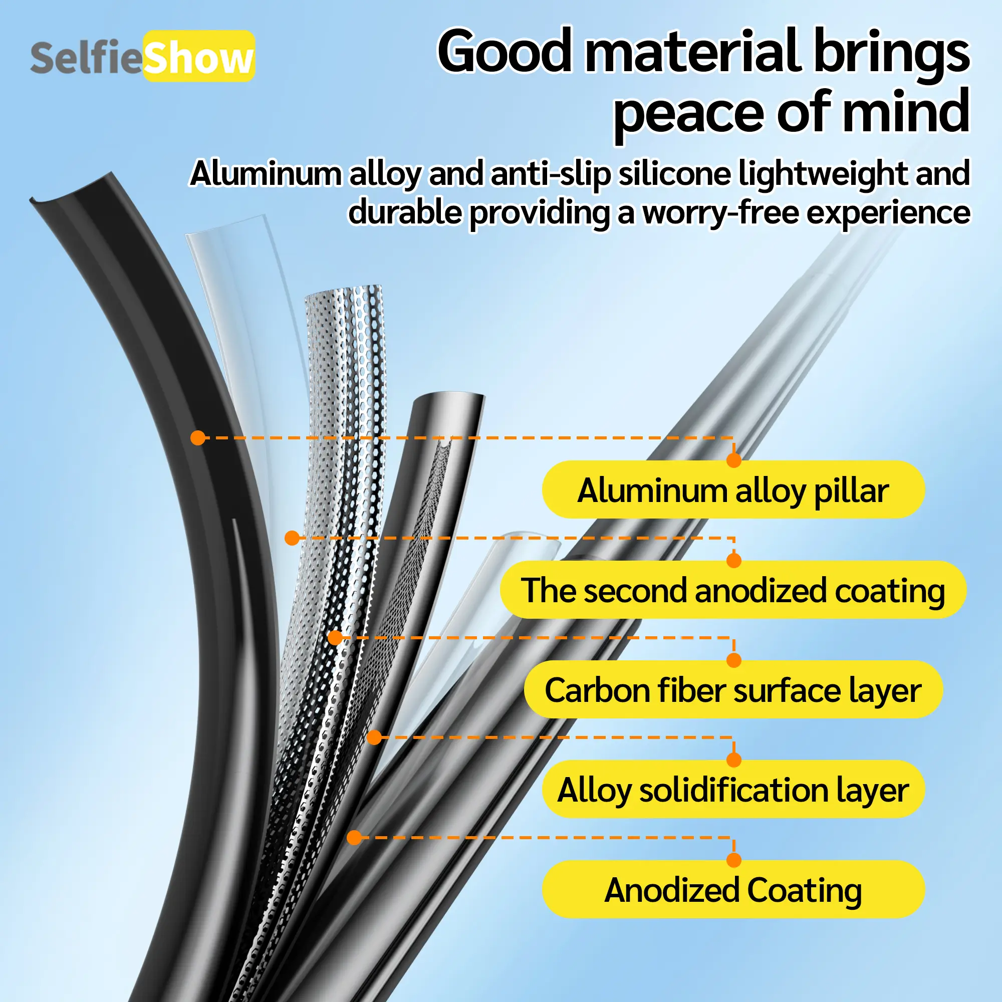 This tripod telescopic rod is made of aluminum alloy. It reaches a maximum height of 64 inches and folds down to a compact 14 inches.