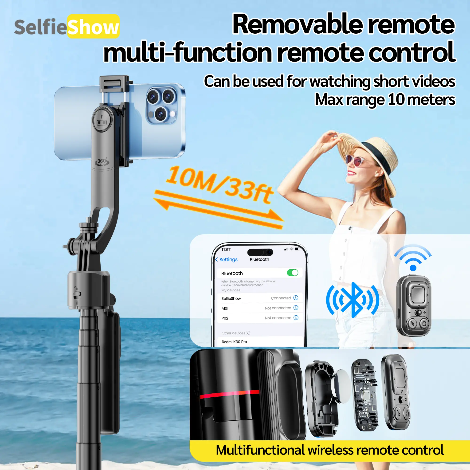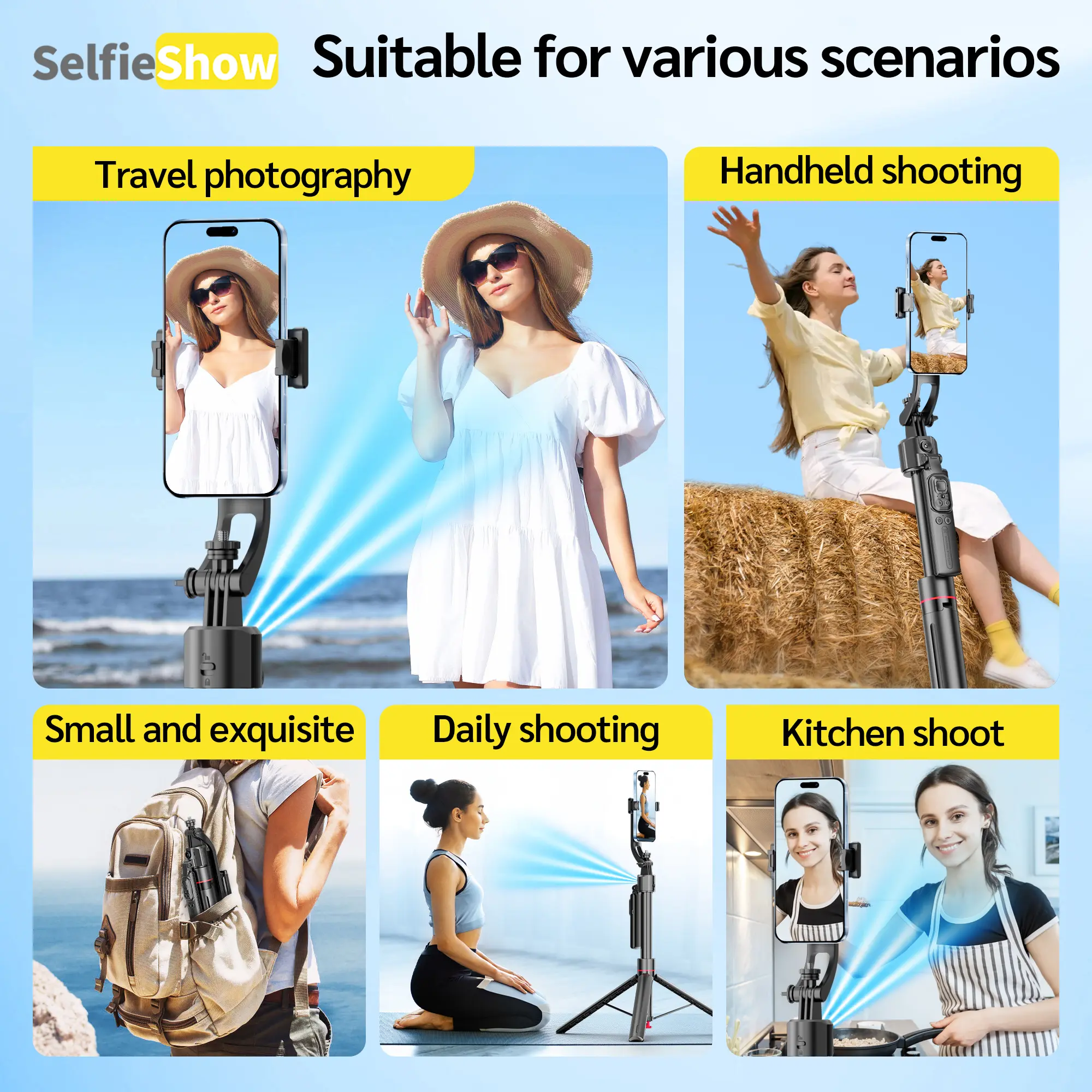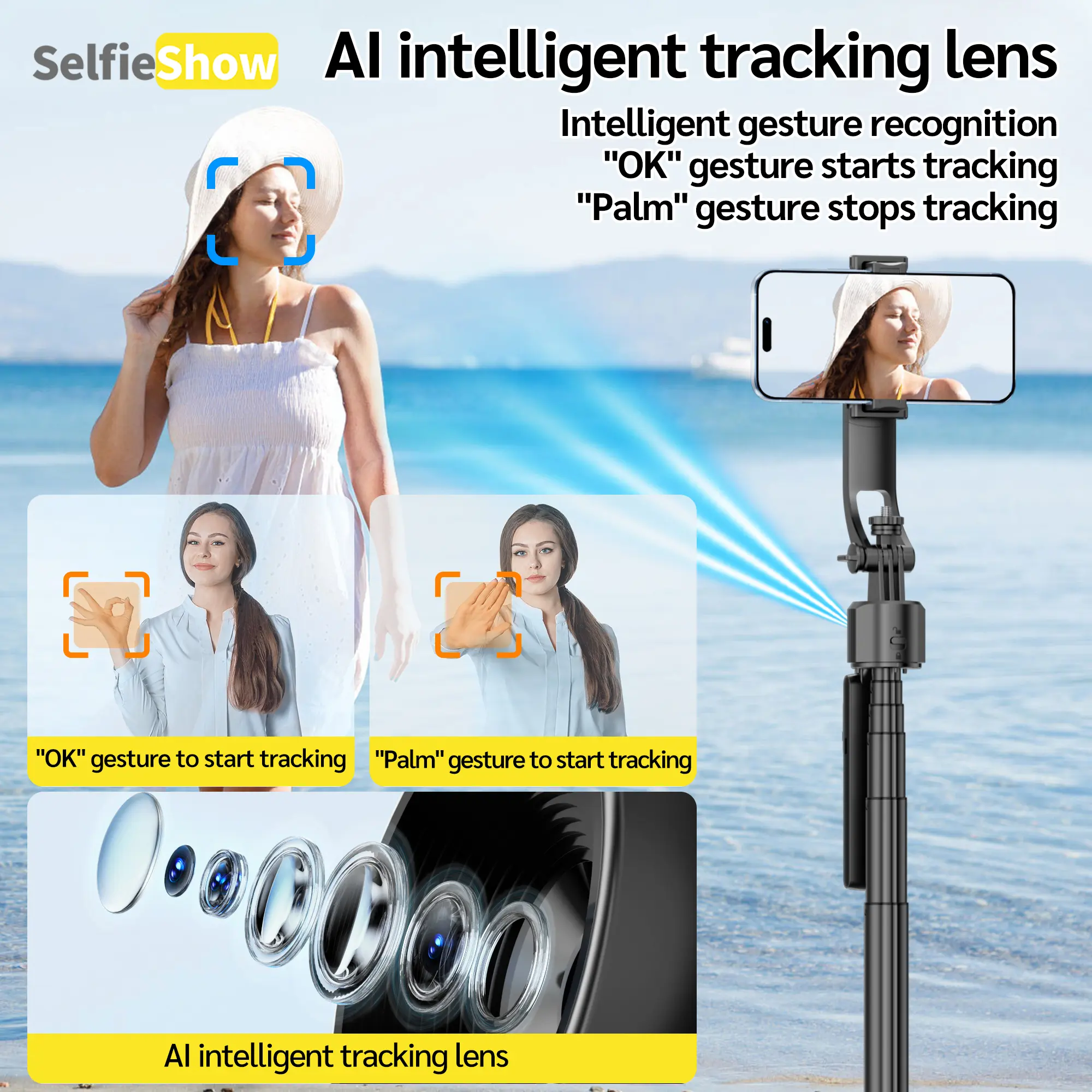 Our selfie stick tripod features advanced 360° automatic face tracking. Press and hold the power button on the handle; it automatically recognizes and locks onto your face. Intuitive gesture controls ensure you stay in focus for every shot. Wave your hand with "OK" to start tracking, and "Palm" to stop. Perfect for TikTok vlogs and travel content creation.