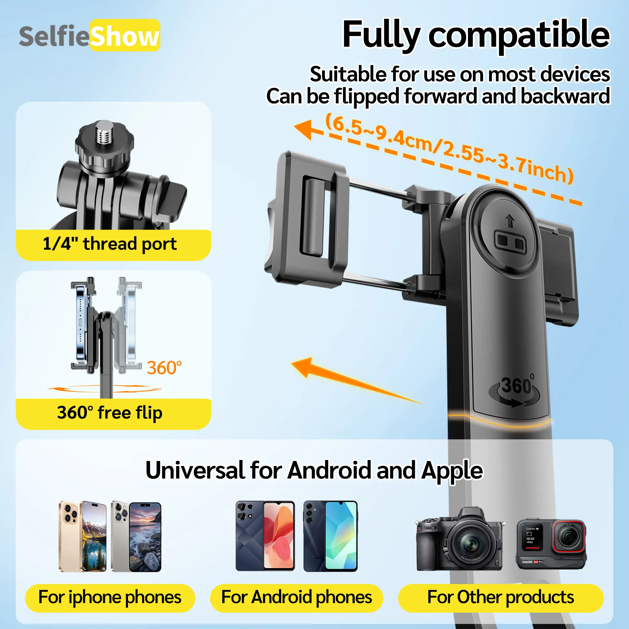 The tripod has a standard 1/4 inch interface for mounting ring lights, sports cameras, and mobile phone mounts. The included phone holder extends 2-4 inches wide to securely hold any size phone. Mount various devices with ease.