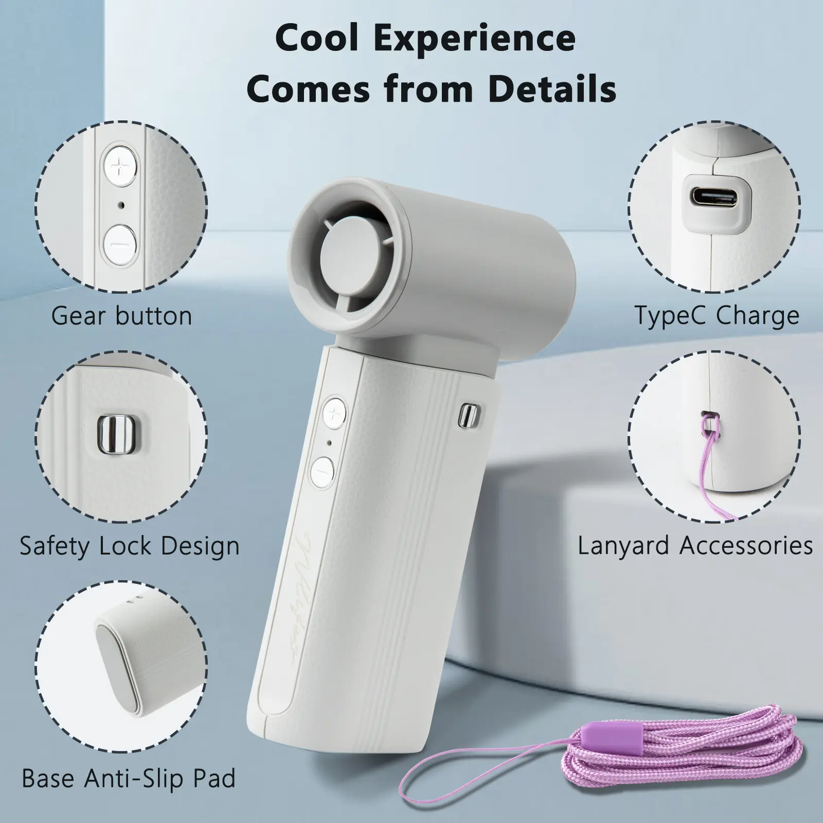 ·Designed with portability and aesthetics in mind, this mini fan features a sleek cylindrical body with a modern minimalist look.