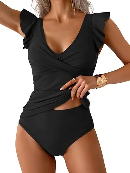 ·High waisted bathing suit bottom: Modest tankini with a high waist bottom have good coverage and support. The waistband has sufficient stretch, ensuring maximum comfort and creating a visually slimming effect