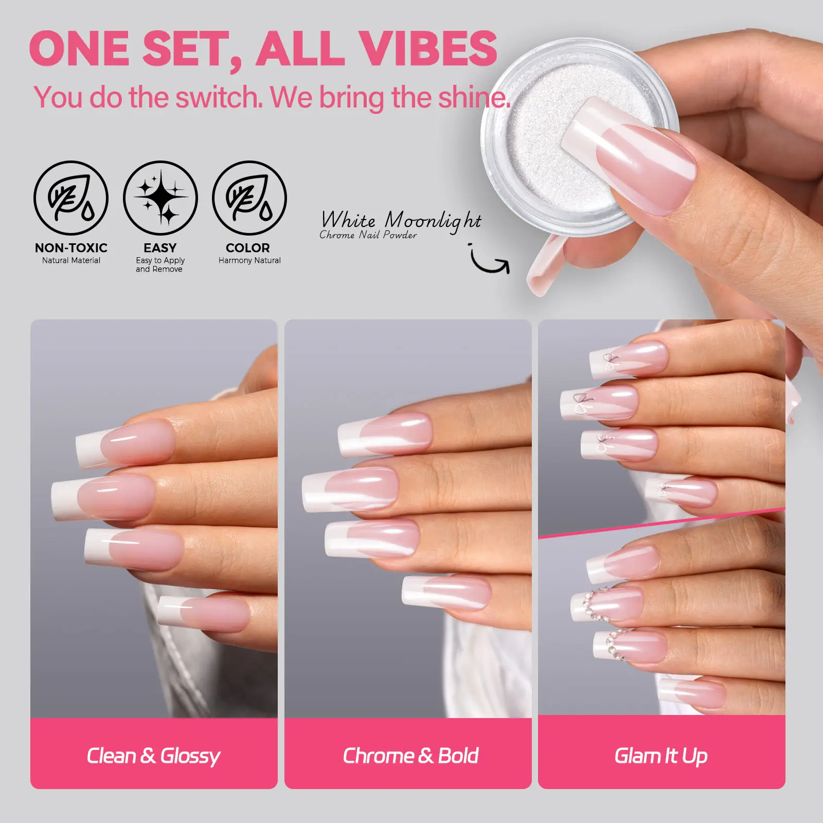 2. Real chrome powder for a glowy finish you can feel.