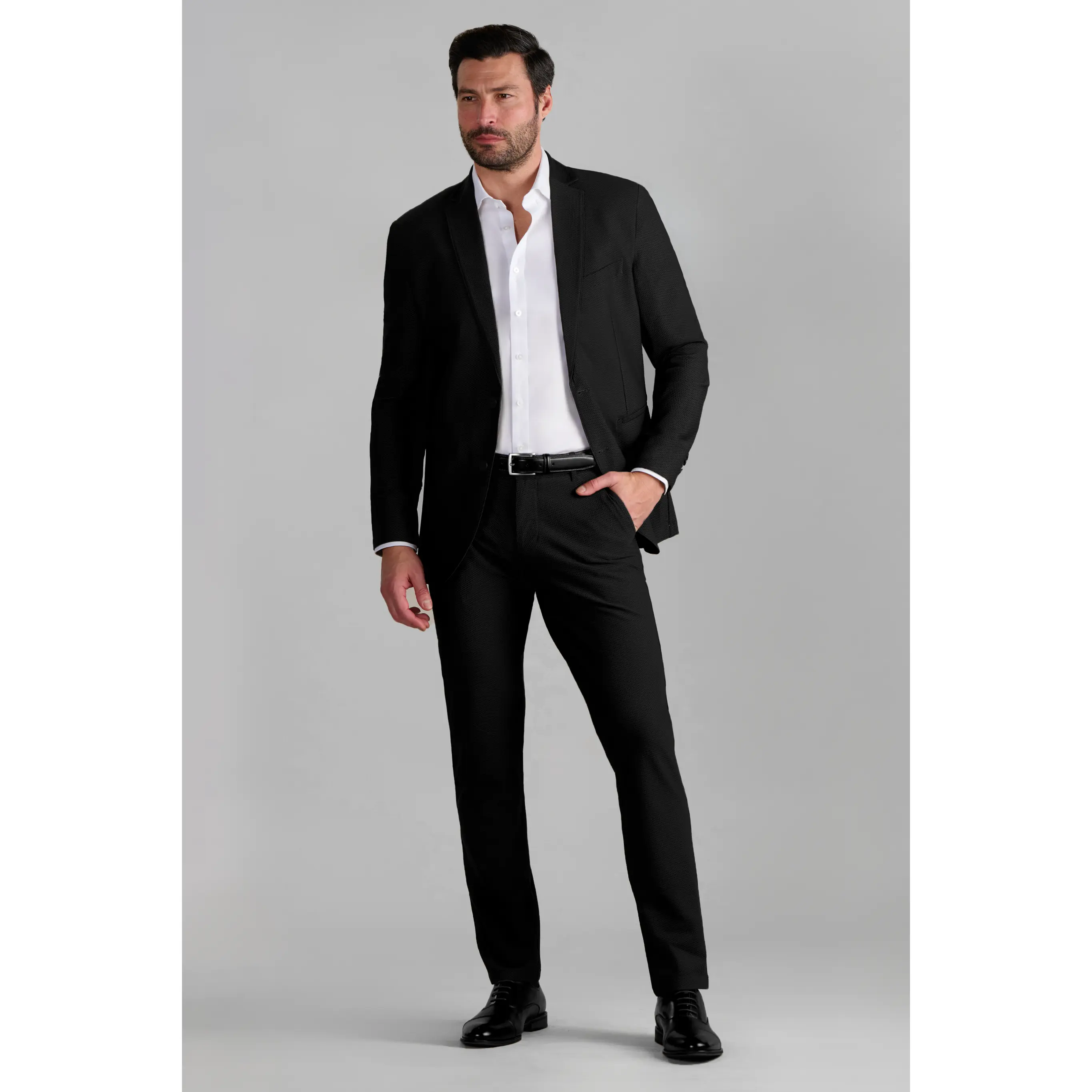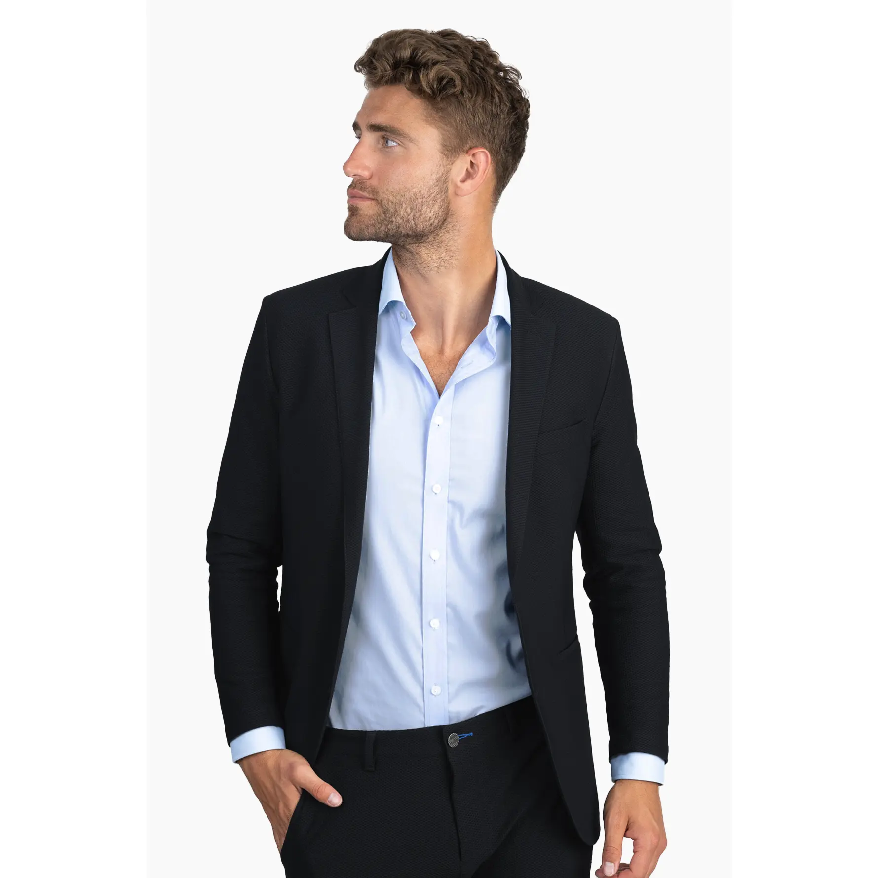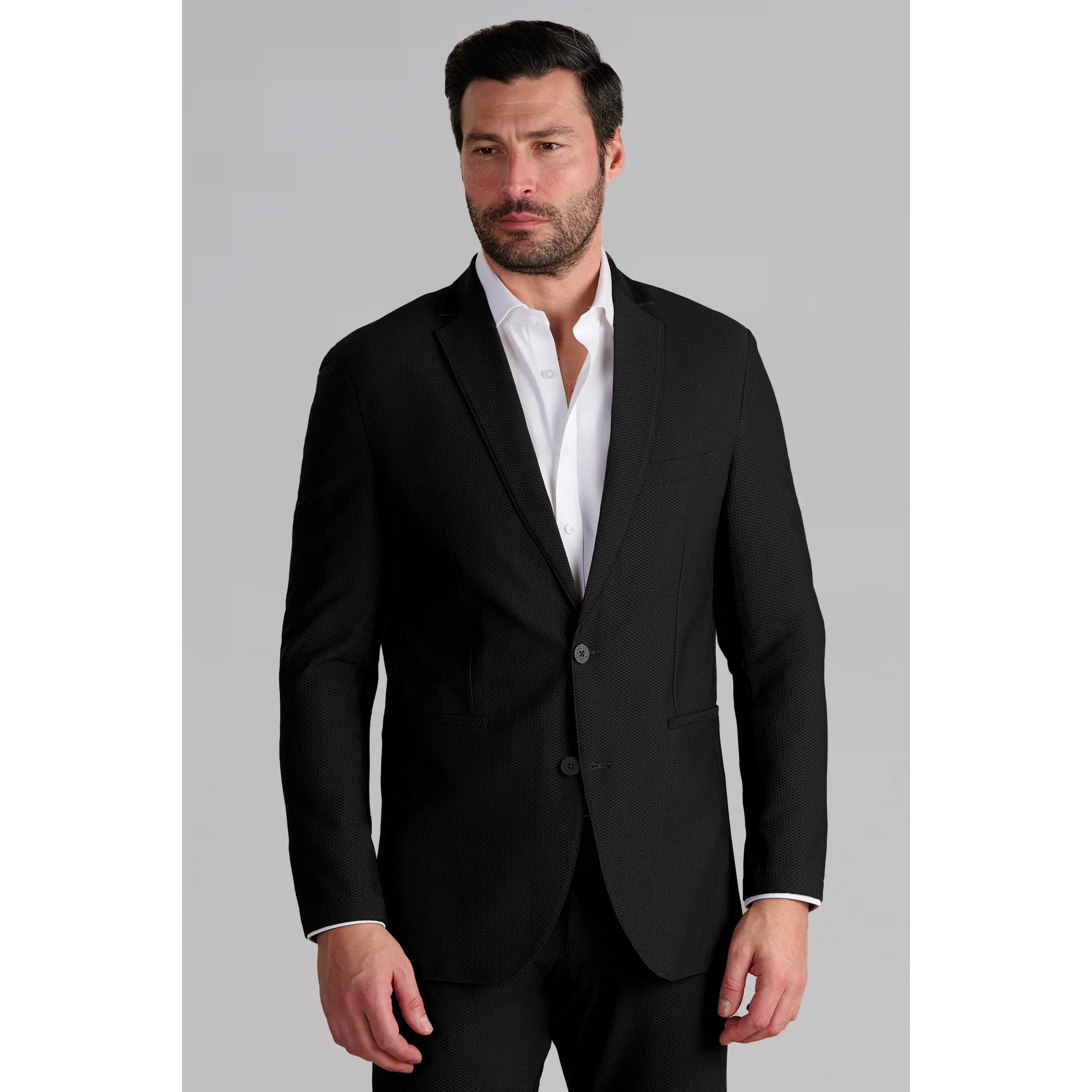 What's the problem with traditional suiting? The heat! We took the cooling mesh fabric that’s commonly found in sportswear, and upscaled and retailored it for use in The Air Suit. This breathable suit functions like all Twillory Suits and Blazers; extreme stretch and comfort, no wrinkles, plenty of pockets, and is machine washable. Don't be that dressed-up overheated dude with an overused sweaty tissue in your pocket - stay cool and airy in this black summer blazer all day long!