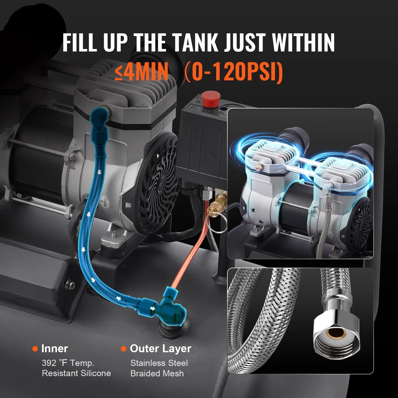 ·Fast and Efficient Inflation: Our oil-free air compressor adopts tube and cylinder intake, effectively saving time and effort. The intake pipe is made of high-temperature resistant silicone and stainless steel braided mesh, with double protection to reduce damage and corrosion.