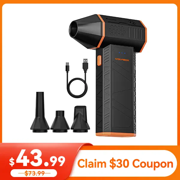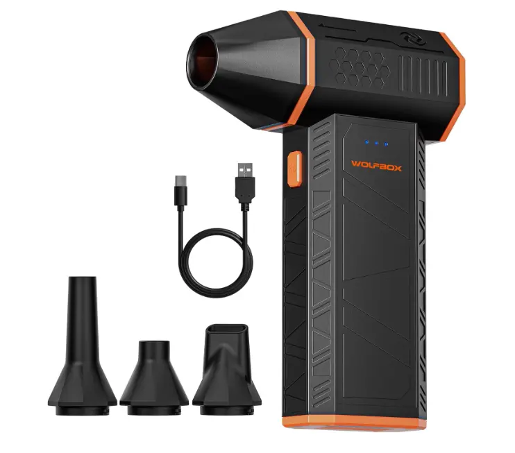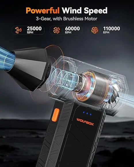 ·Powerful Turbo Fan:WOLFBOX MegaFlow50 electric air duster reaches speeds of up to 110,000 RPM, effectively removing dust and debris. It features three adjustable speed settings to suit different cleaning tasks.