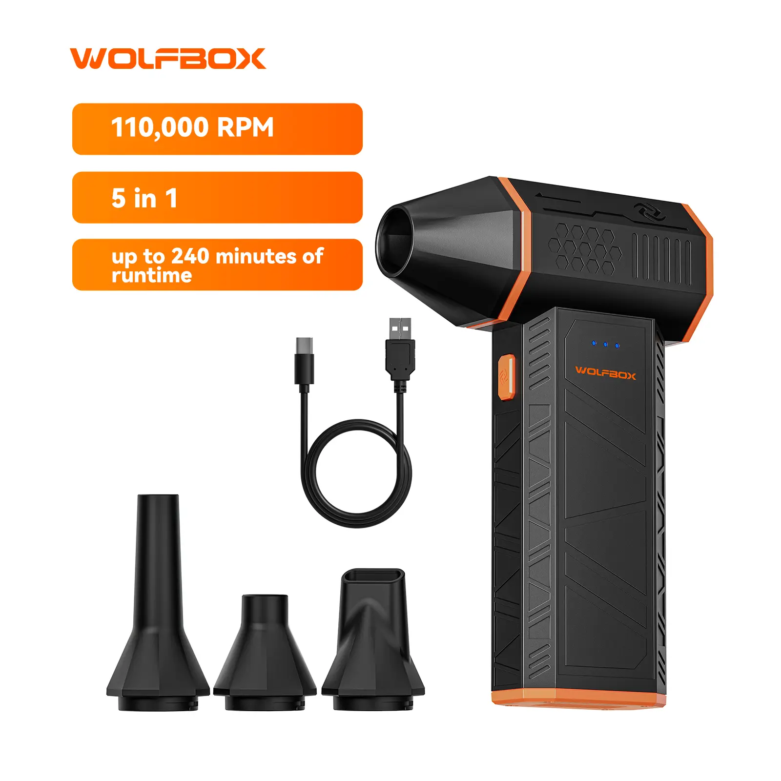 ·3.5 Hours Fast Charging: WOLFBOX MF50 electric air duster recharges in just 3.5 hours with a type-C cable. Enjoy up to 240 minutes of use on the lowest setting, with four charging options to suit your needs.