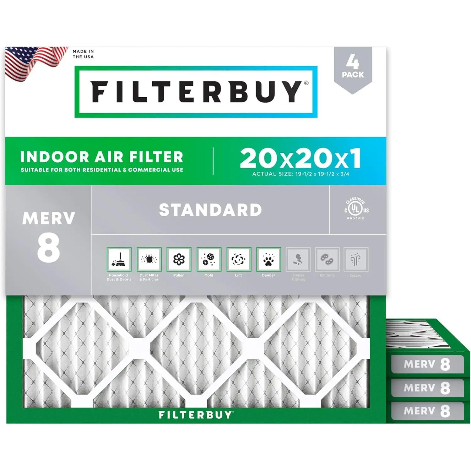 The Filterbuy replacement air filter 20x20x1 (actual size: 19.50" x 19.50" x 0.75") ensures that your furnace, air conditioner, heat pump, or HVAC system is circulating the cleanest air possible to help preserve your budget and healthy lifestyle. MERV 8 synthetic media (comparable with Clean Living Dust Defense MPR 600 & FPR 5) is recommended in most scenarios due to its capability to trap 90% of airborne particles, protecting your home or business from debris, lint, pollen, mold, dander, and other forms of dust without impacting air flow. High quality construction features an electrostatically charged design with 14 pleats per foot that captures more harmful particles and prolongs the products lifespan by three times that of fiberglass models (replace every 90 days for best results). Plus, our industrial grade beverage board frames are paired with dual wire backings that significantly outperform traditional cardboard compositions by improving structural integrity with their ability to endure temperatures up to 200 degrees Fahrenheit and withstand exposure to moisture. Installation is also made simple with the addition of easy-to-understand arrows that help identify the direction of air flow and subsequently the way the filter needs to be placed. To top it off, all our components are 100% manufactured within the United States and designed with recyclable materials, providing an eco-friendly alternative to enhancing your air quality.