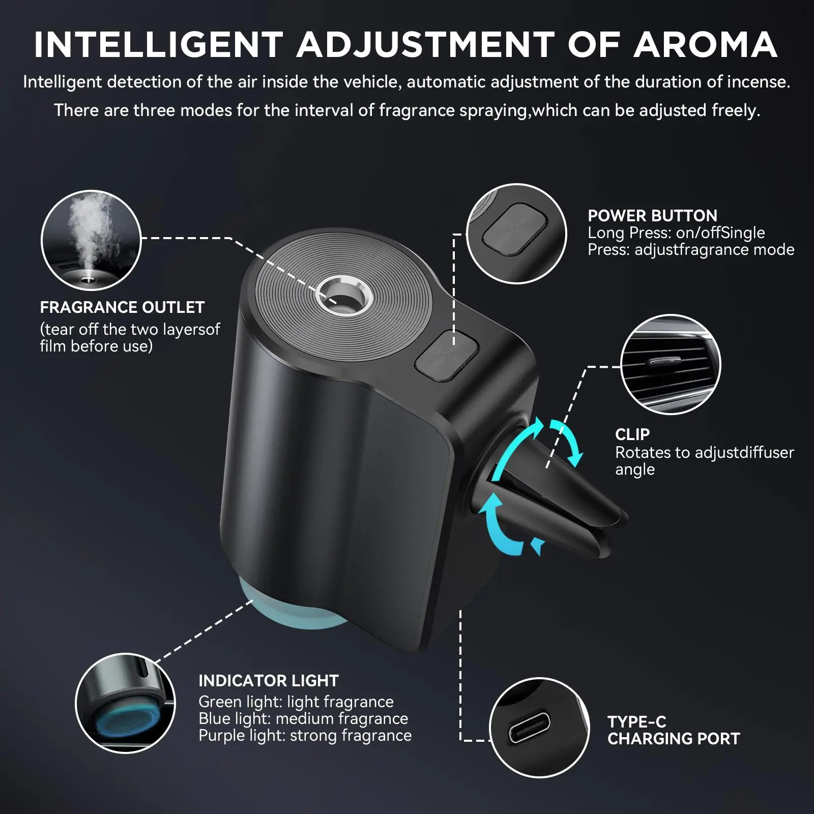 The three-speed adjustable smart car air freshener can be freely adjusted and turned off. It activates and deactivates intelligently, maintaining a pleasant fragrance by detecting the vehicle's running status. This intelligent diffuser ensures a consistent, pleasant scent inside your car.