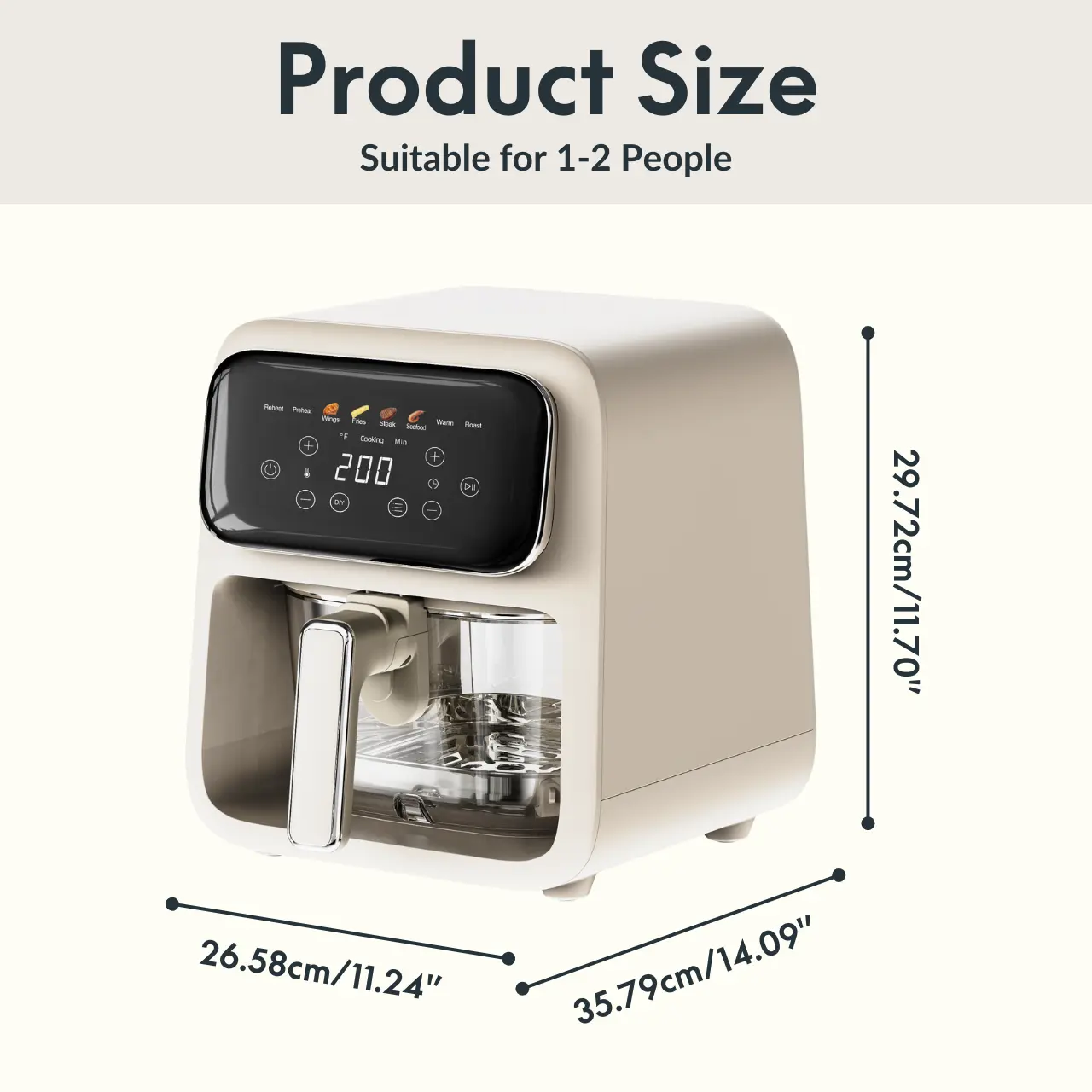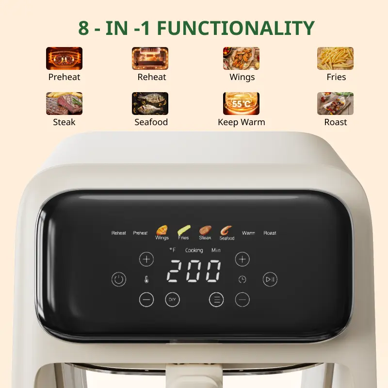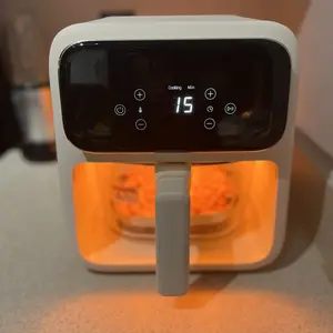 This air fryer is small but perfect for a family of 2-3. We are a family of 3 and this takes little counter space and is the perfect size. It is non toxic which is very important. I was looking for a non toxic air fryer but couldn’t find one. This is also easy to wash. It is also very quiet.