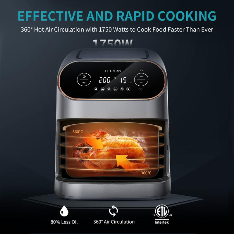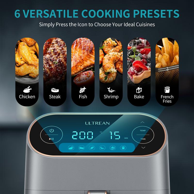 ·Versatile Cooking Options: The large air fryer includes 6 presets for accurate cooking times and temperatures; press a button for chicken, steak, fish, shrimp, bake, french fries, and the air fryer does the rest for you; with a wide range of temperature from 180℉ to 400℉ and time up to 60 minutes, it allows you to adjust the settings to your needs during the cooking process