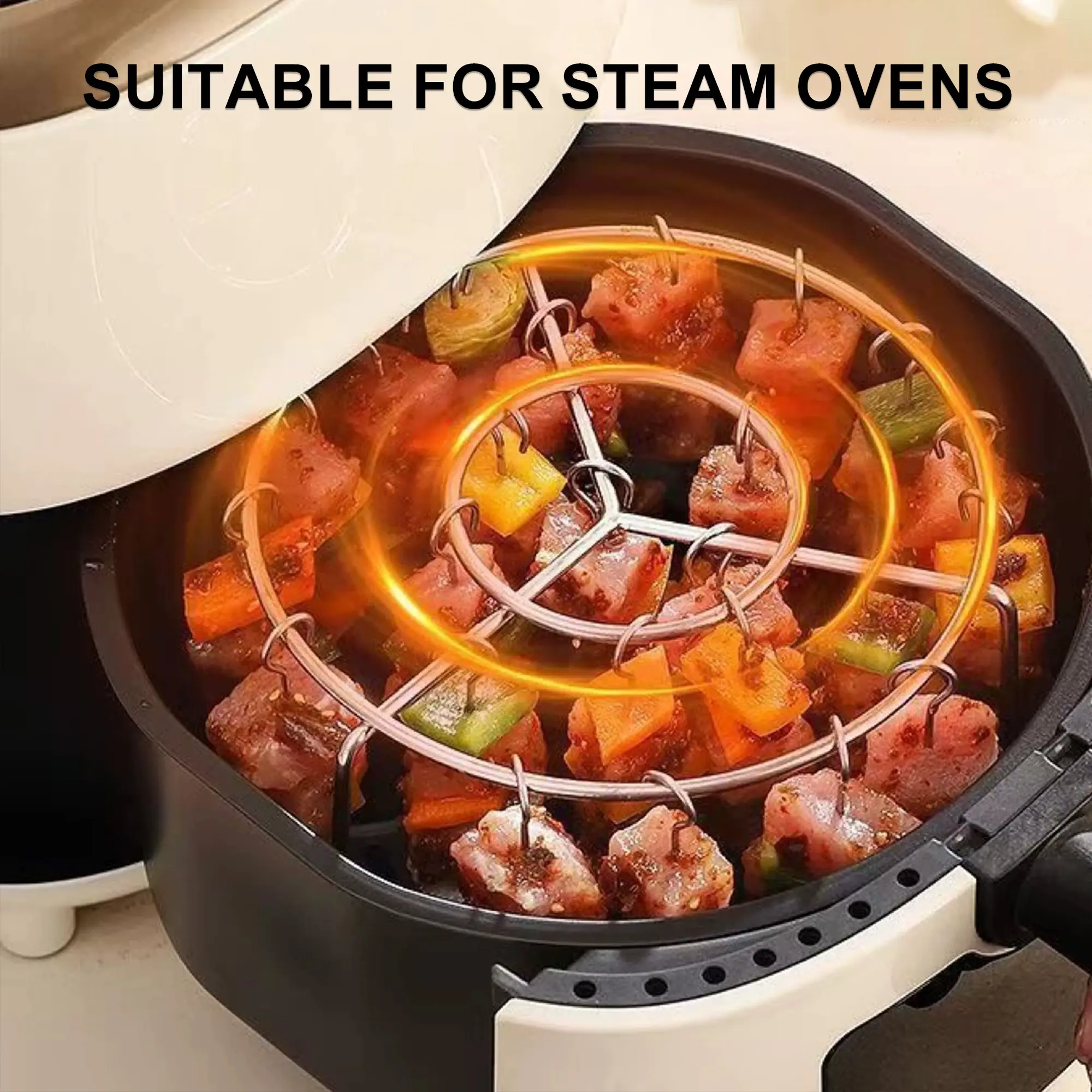 【All-Round Even Baking】 This air fryer skewers is designed for air fryer, using advanced no-turn technology, equipped with 24 hanging stainless steel skewers, maximizing the cooking area, significantly improving the grilling efficiency, each side of the ingredients can be evenly heated, to achieve the ideal colouring and cooking results