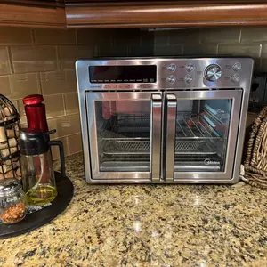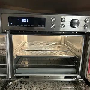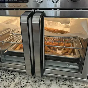 Horno con puertas francesas, estoy encantado.Es un aparato muy completo y fácil de usar. Con muchísimas funciones: air fry, bake, broil, roast, pizza, reheat, warm, slow cook y más. Todo se controla con perillas, se ve precioso en la cocina, lo recomiendo para comer más saludable y ahorrar tiempo