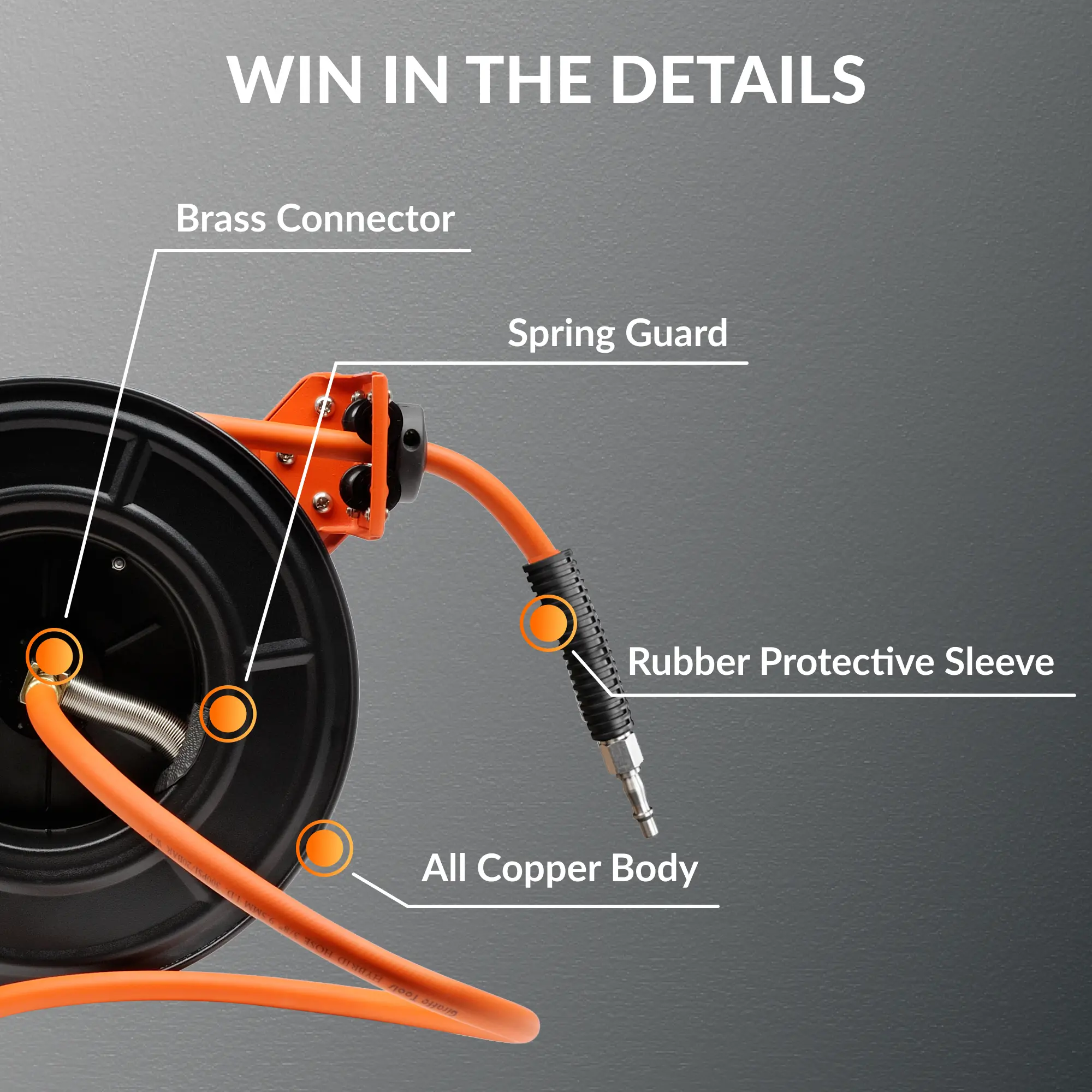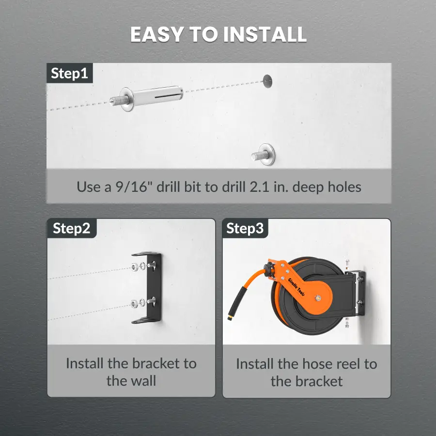 ·Automatic Rewind Hose Guide: Simply give the hose a gentle tug and the air compressor hose reel will retract all the way back in without kinks. Equipped with a hose guide system makes the hose fits neatly on the reel.