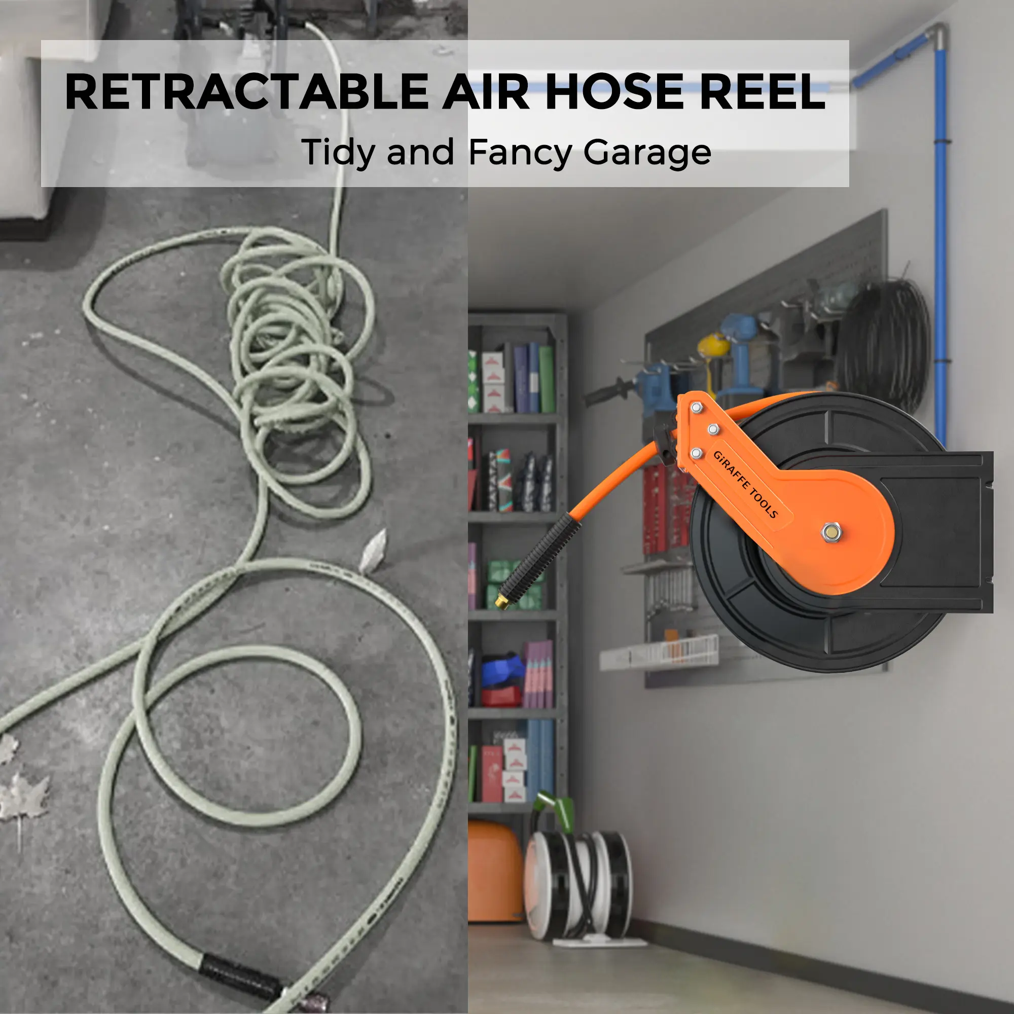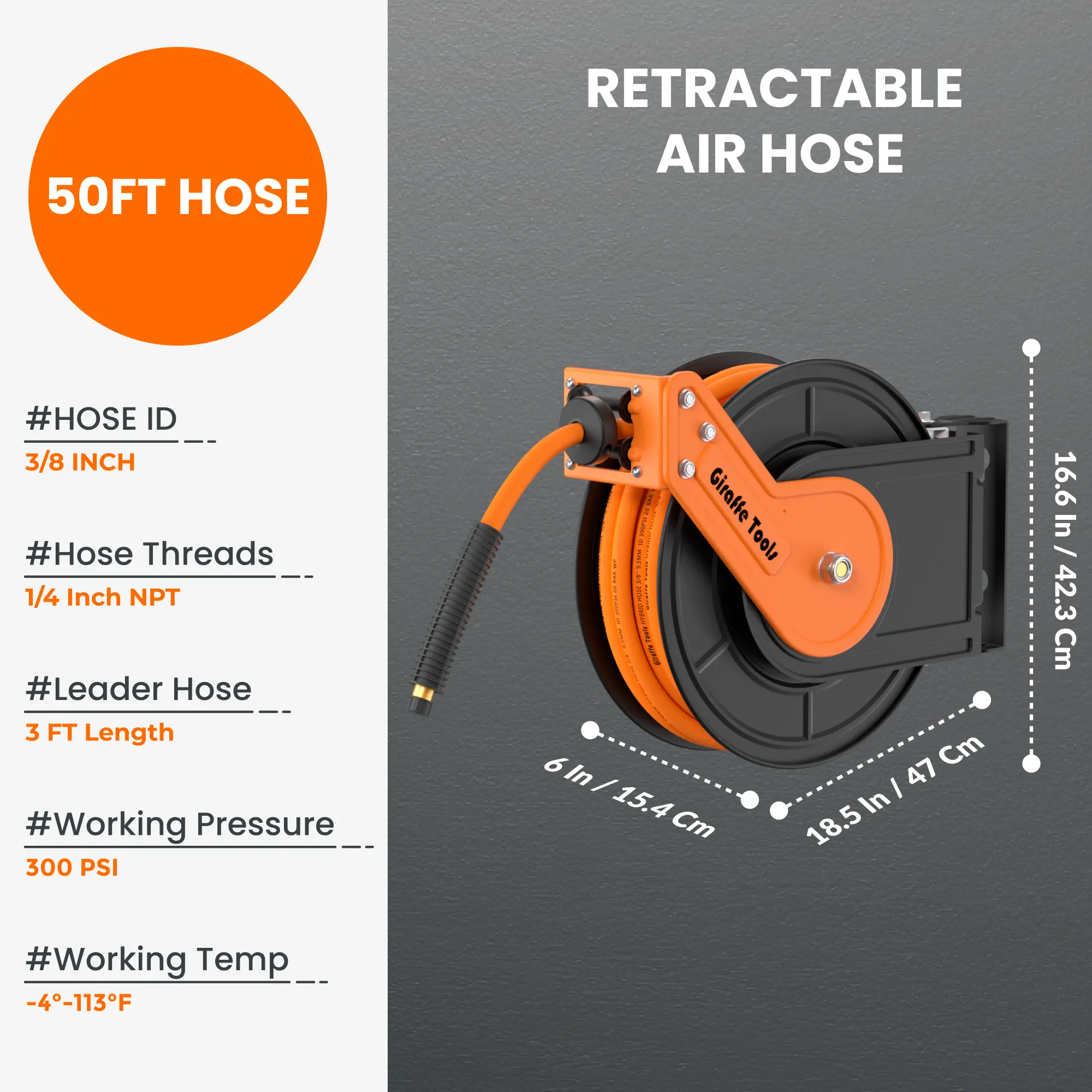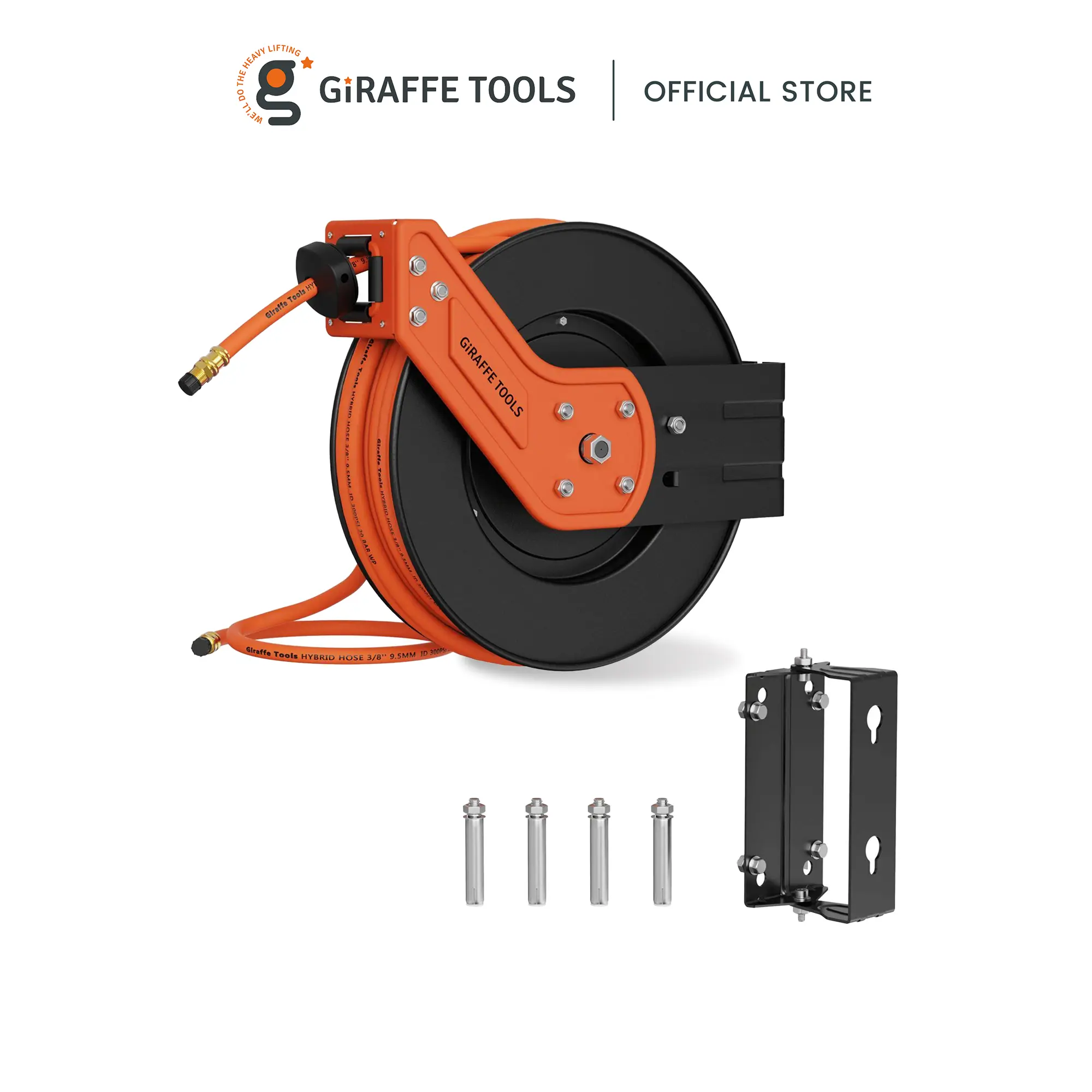 Giraffe Tools Retractable Air Hose Reel-Alloy Steel Reel-3/8in x50 FT Hybrid Air Hose Max 300 PSI,Wall Mount Heavy Duty Double Arm Steel Reel