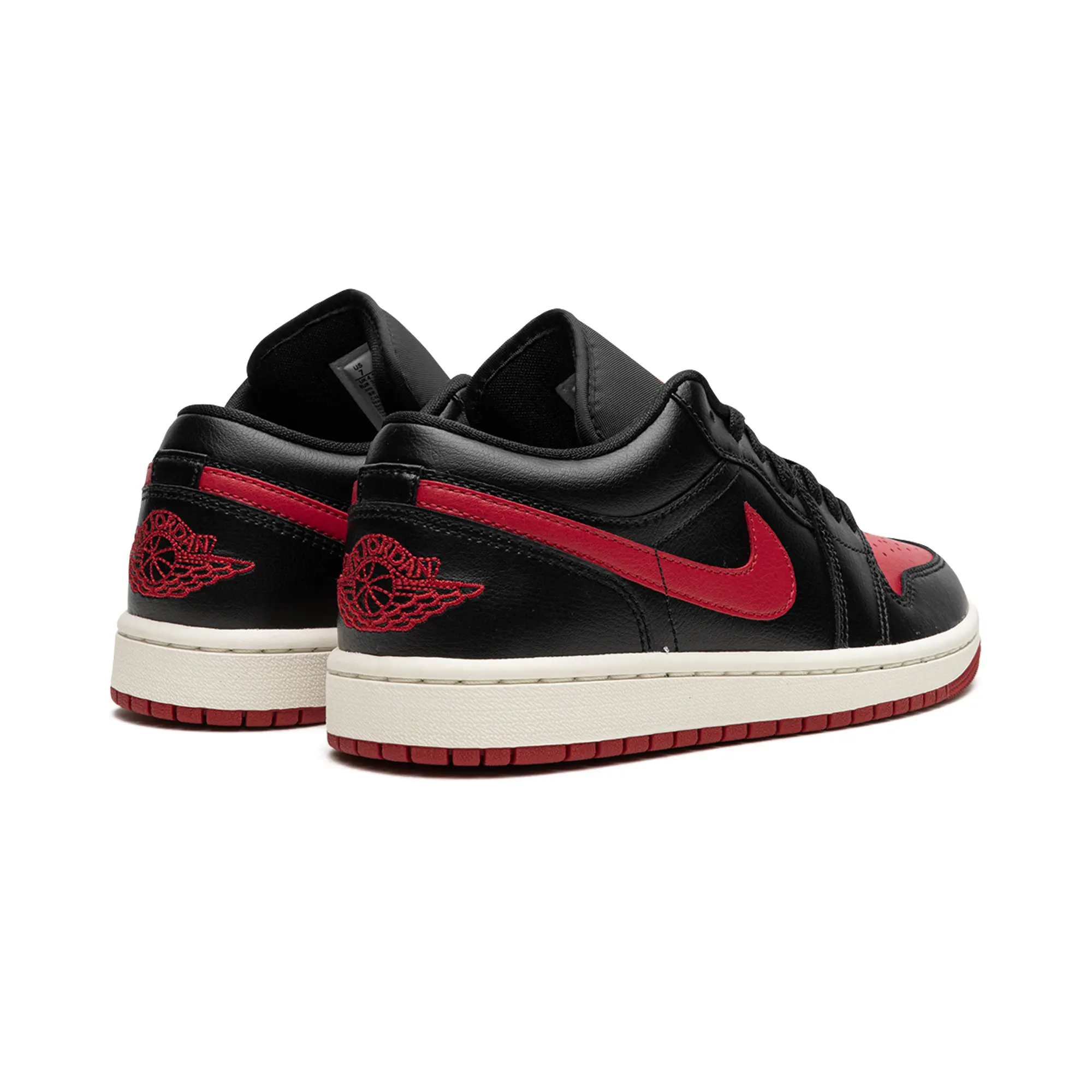 The Women’s Air Jordan 1 Low "Bred Sail" is a women’s-exclusive colorway of the retro basketball shoe inspired by Michael Jordan’s time with the Chicago Bulls. The shoe features a glossy Gym Red perforated leather toe with contrasting black leather overlays. More black leather can be found on the mid-panel and on the heel. A red leather Swoosh appears on the sides and a red “Wings” logo is found on the heel. Red Jumpman branding is embroidered on the black nylon tongue. A Sail rubber midsole gives the shoe a vintage-inspired look. Release date: April 28, 2023