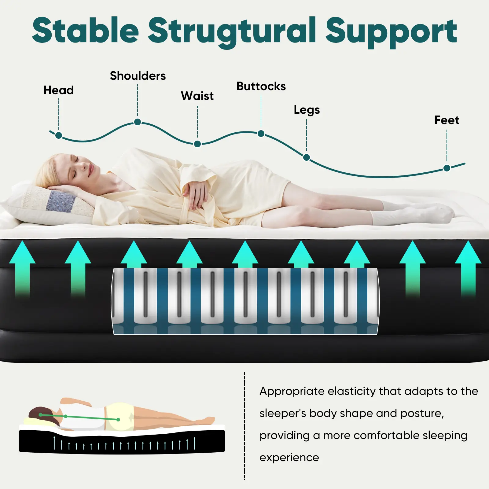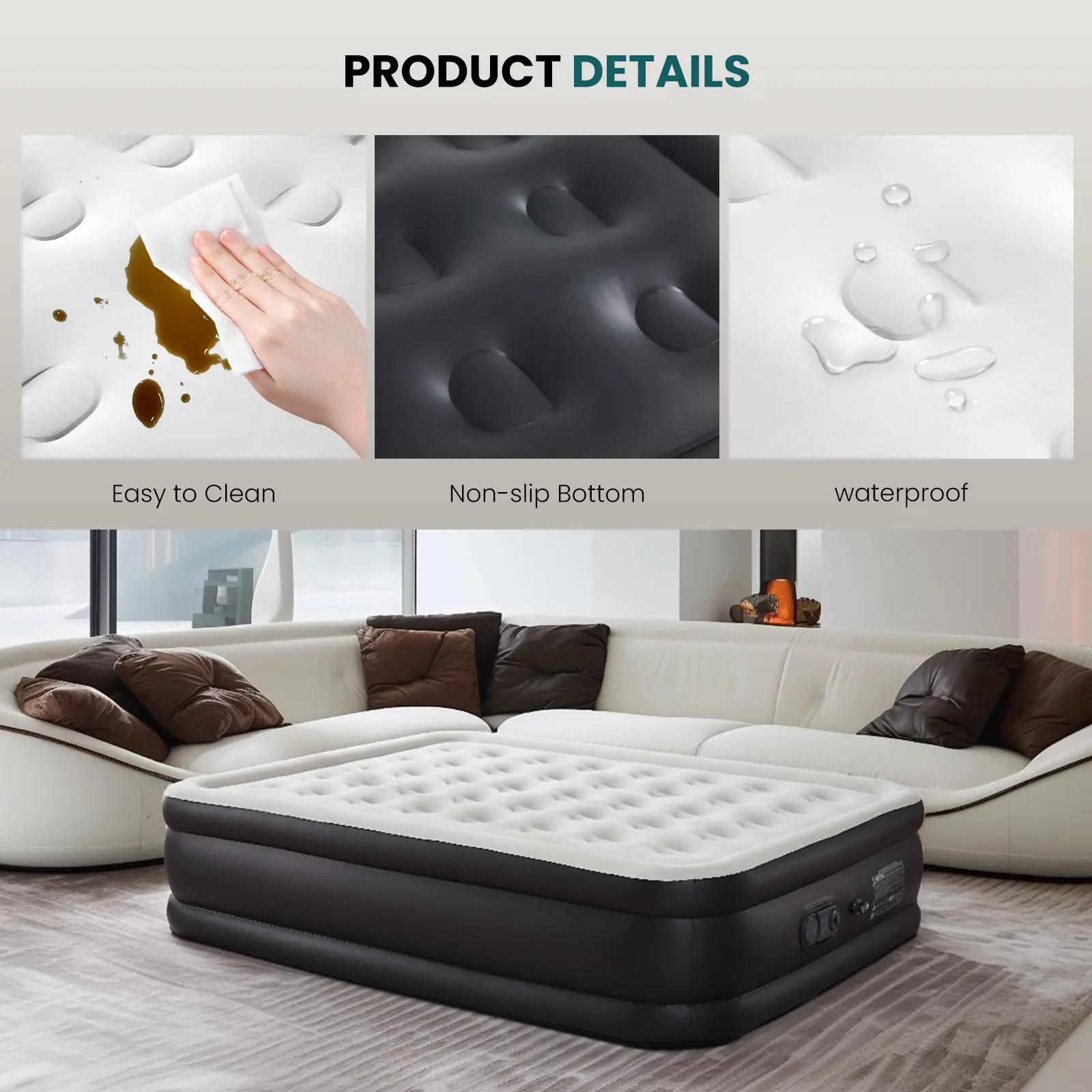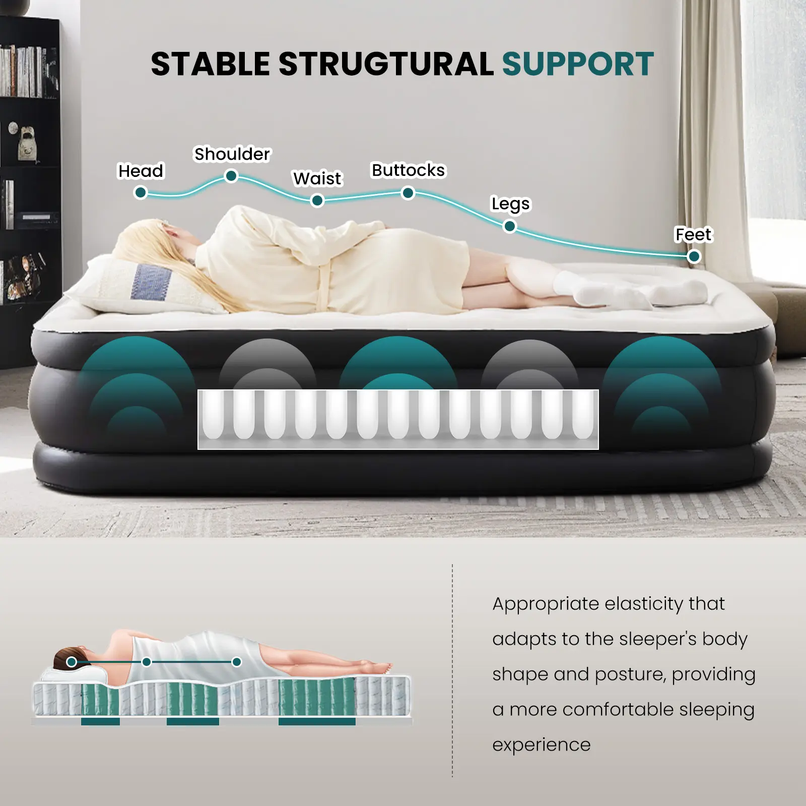 ·UPGRADED INTERNAL STRUCTURE: The camping mattress is designed with a honeycomb column structure inside, which can withstand more weight and pressure and is not easy to collapse, with a maximum load capacity of up to 660lbs. Adopting PVC material, the inflatable mattress is anti-scratch, tough and wear-resistant, and not easy to deform, so you can enjoy the ultimate comfort and support.