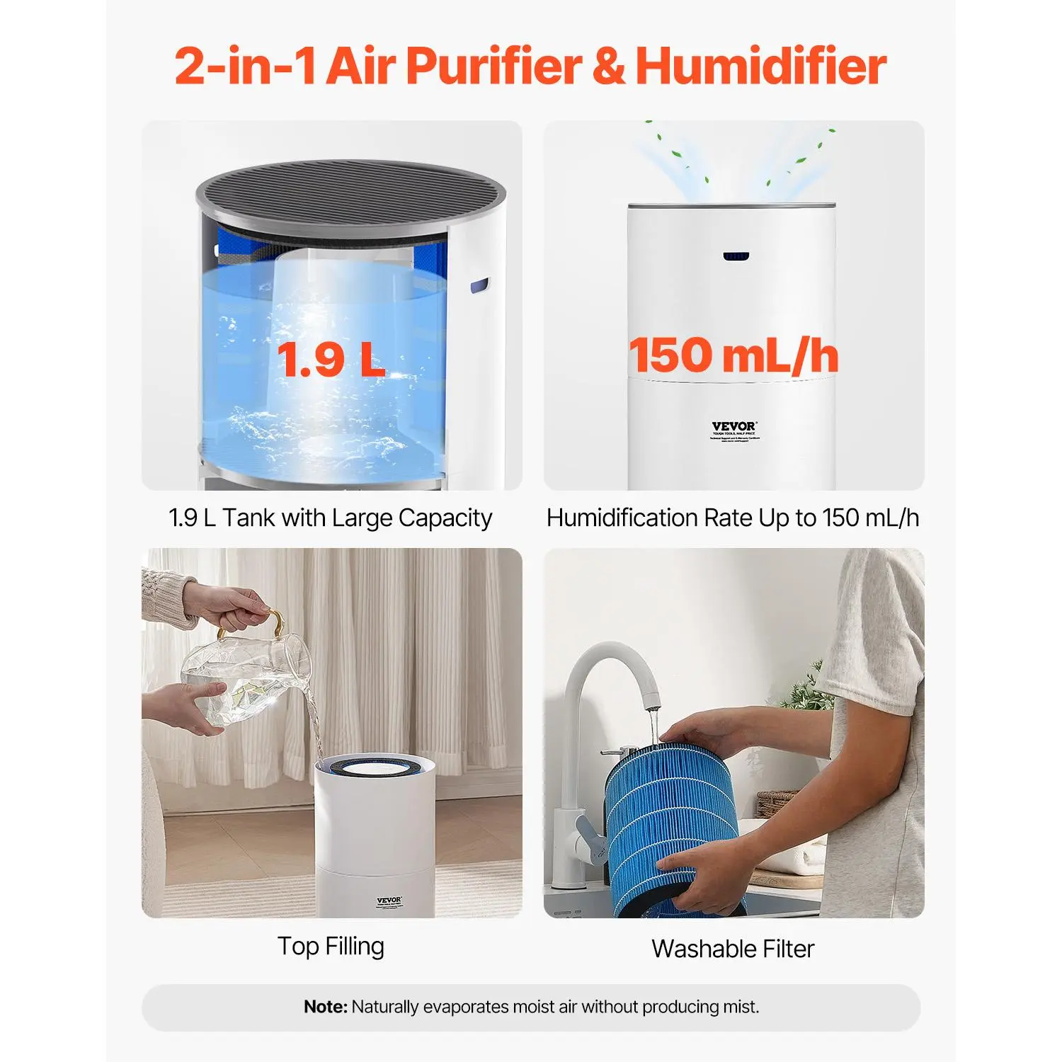 • Low Noise Operation: This air cleaner's minimum noise is no more than 22dB, and its sleep mode is especially suitable for households with babies or sensitive users. The 1.9 L water tank delivers 150 mL/h of humidification, relieving dryness in autumn and winter and improving skin and respiratory comfort.