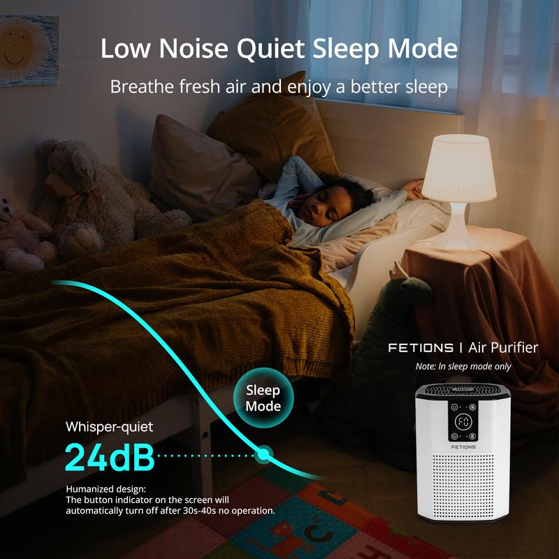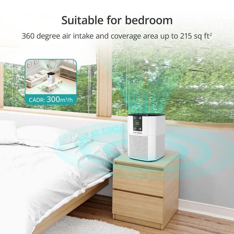 ·HEPA highefficiency filtration: Fetions air purifier H13 true HEPA filter has a very powerful purification function, capturing up to 99.97% of 0.3 micron particles, which can effectively remove allergens such as pet dander, dust, pollen, etc. in the air, and can quickly improve indoor air quality. It is the best choice for families with pets, babies, children, and the elderly.