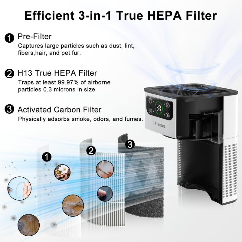 ·HEPA AIR PURIFIER: Features a 3-stage filtration system—pre-filter, H13 true HEPA filter, and high-efficiency activated carbon filter—effectively capturing dust, pollen, and pet hair as small as 0.3 microns. Perfect for pet owners, babies, children, and seniors to improve indoor air quality.