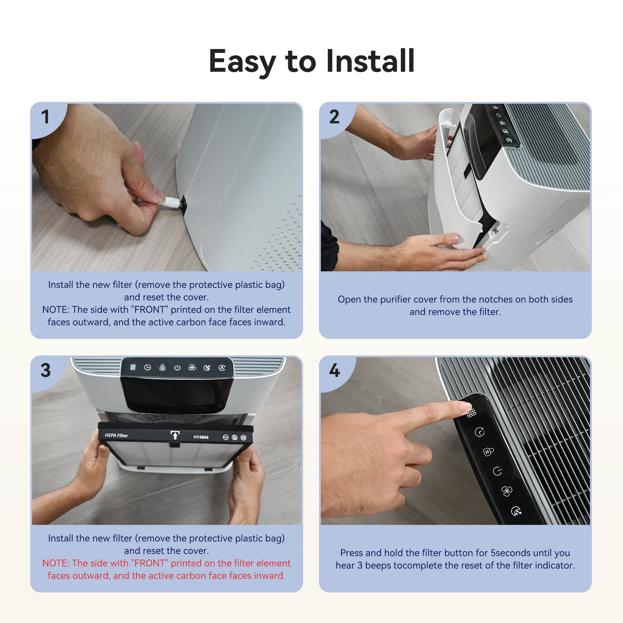 ·Maintenance Tips: The service life of our filters is usually 2200 hours. It is recommended that you replace the filter every 6 months. After replacing the filter, press and hold the filter button for 5 seconds until you hear 3 beeps to complete the reset of the filter indicator.