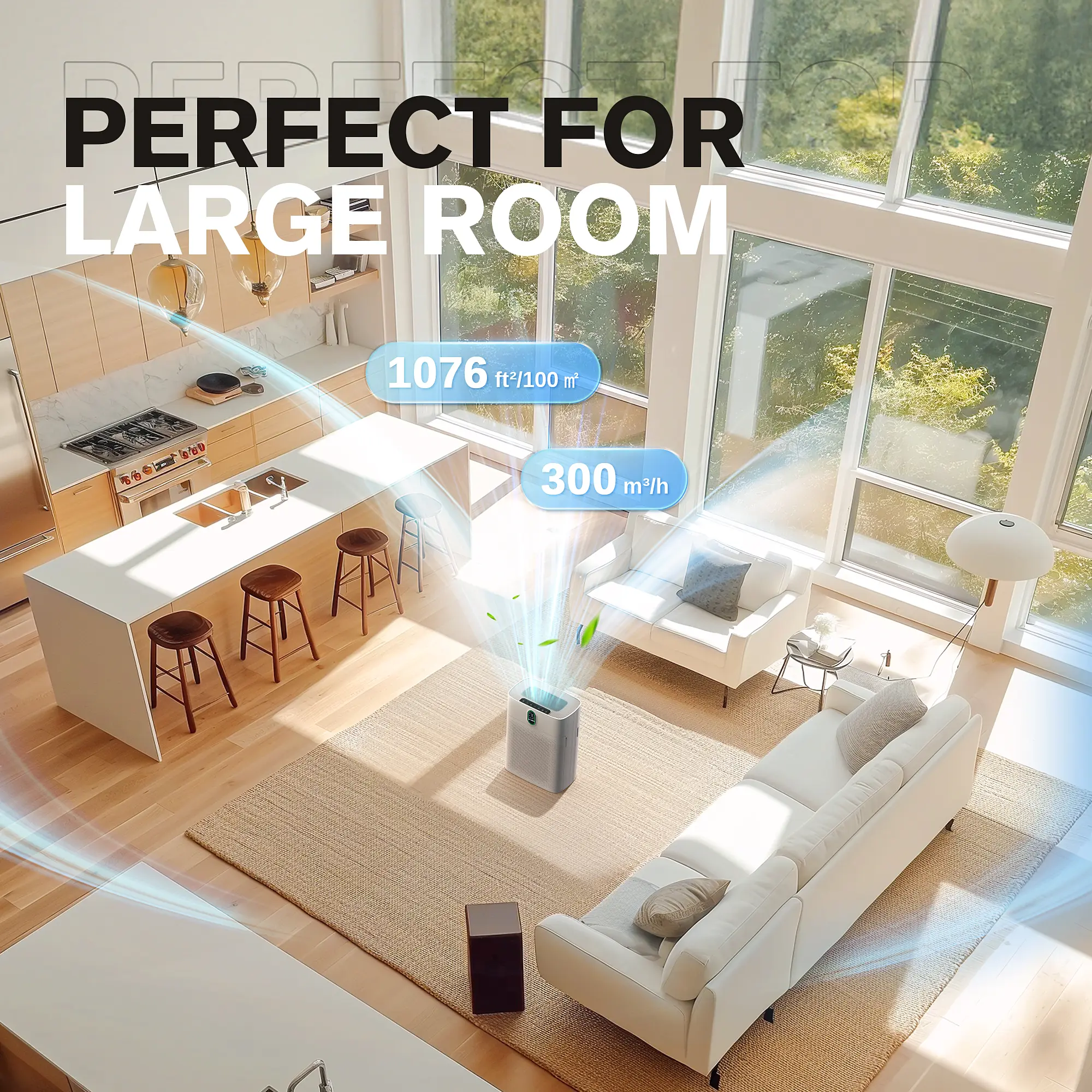 ¡Dual Side Air Intake: This air purifier for home large rooms is designed with dual air intakes. Compared to the single air inlet design, it performs purification work on both sides simultaneously, greatly improving the purification speed. Our air purifier for allergies CADR is up to 300 (m ³/ h) For a 1076 square foot/100 square meter room, it can refresh the air every hour, giving you a healthy and fresh breathing environment in smoke..