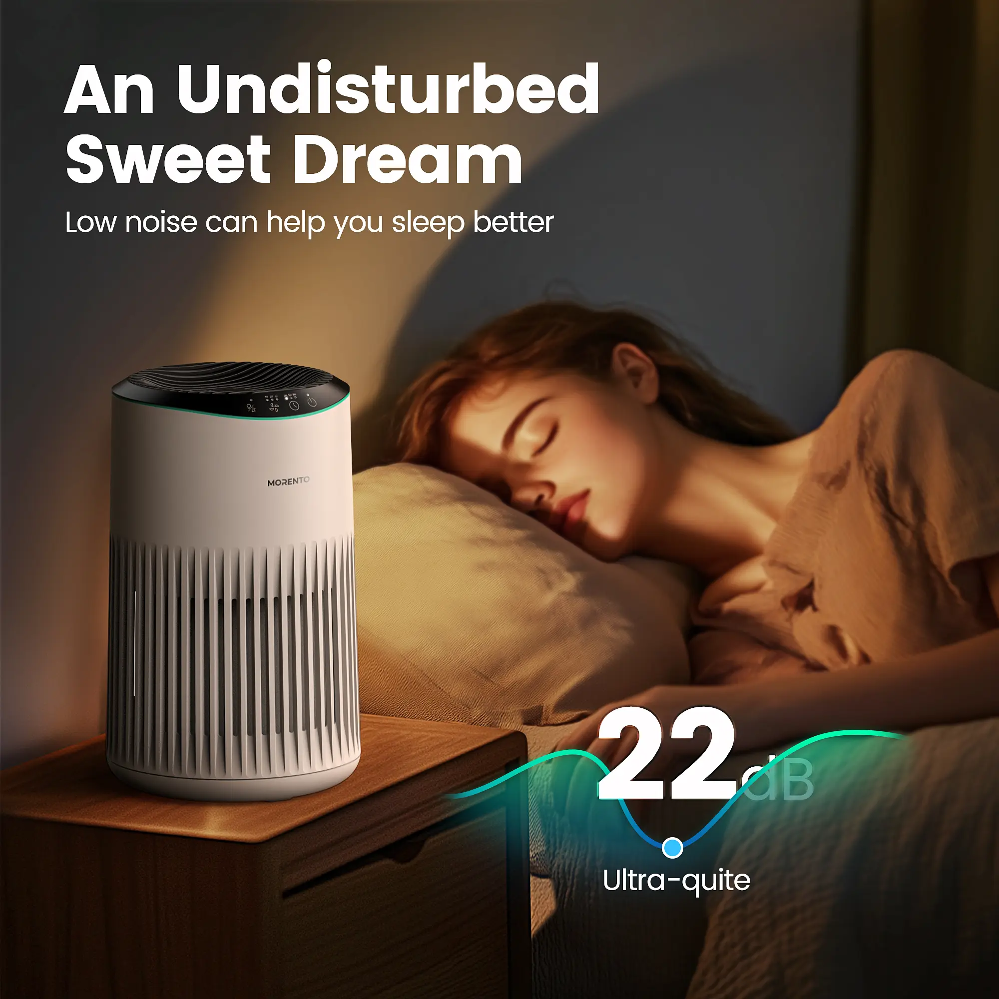 ·In 22dB Serenity: The air purifier not only cleans your air but also enhances your room's ambiance with a built-in blue ambient light. Simply switch to sleep mode and let the gentle glow fade away after three seconds. With an ultra-quiet operation at just 22dB, you'll drift off to dreamland in a peaceful, light-free environment that's perfect for a restful night's sleep