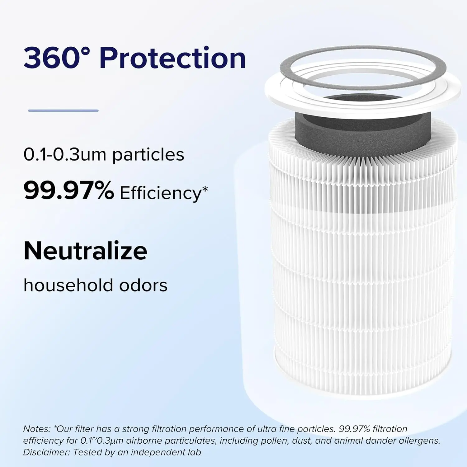 𝐏𝐎𝐖𝐄𝐅𝐔𝐋 𝐏𝐔𝐑𝐈𝐅𝐈𝐂𝐀𝐓𝐈𝐎𝐍: Captures at least 99.97% of 0.3-micron airborne particles, while statically charged fibers trap viruses and bacteria