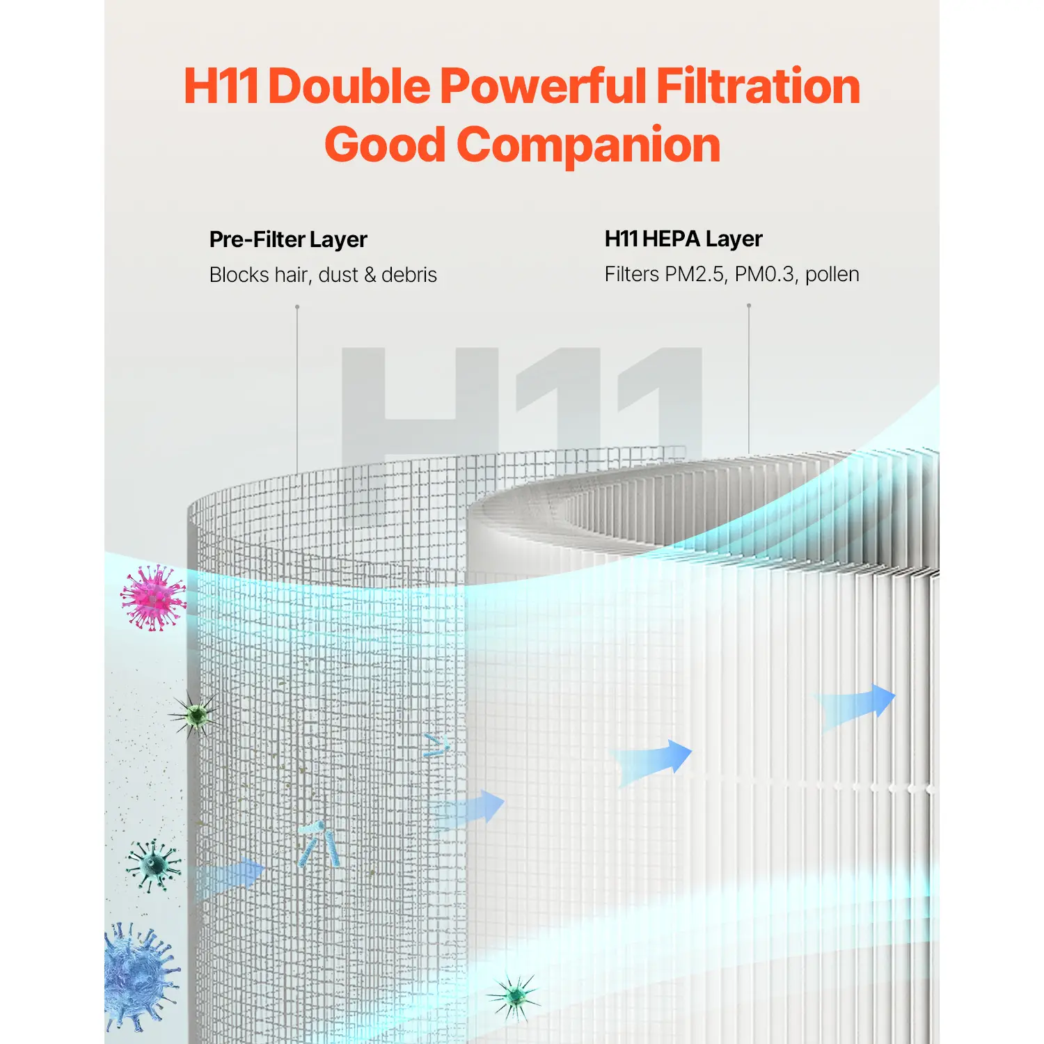 • Replacement Filter for Home Air Purifiers: The H11-grade filter effectively captures particles between 0.1–0.3 microns, removing 99.97% of dust, pollen, and allergens. It’s particularly suitable for air-sensitive individuals, such as the elderly, infants, and pet owners, ensuring a clean and fresh breathing experience at home.