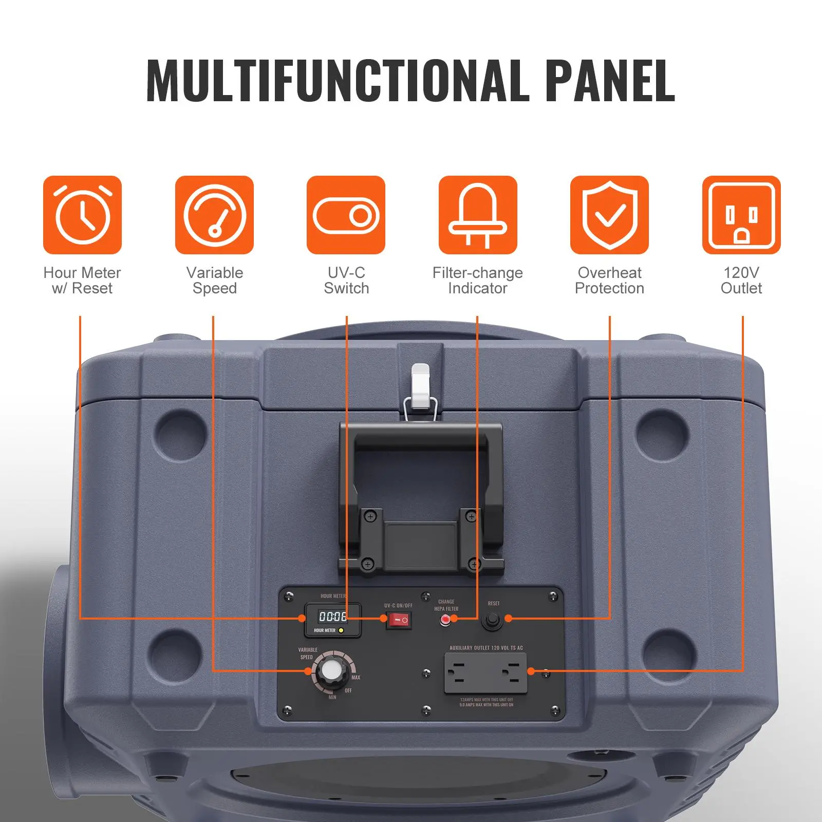 • User-friendly Control Panel: The control panel makes it easy to operate the air purifier's functions, including adjusting the airflow range, setting a resettable timer, turning on/off the UV-C switch, and activating a circuit breaker for overheat protection. Additionally, it has an indicator light that illuminates to remind you when it's time to change the filter. You'll find two auxiliary sockets on the panel, allowing you to daisy chain up to 3 units with a combined airflow speed of 2400 CFM.