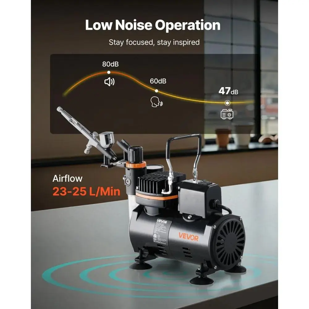 The VEVOR Airbrush Kit, 1/6 HP, includes a dual-action airbrush with 3 tips, hose, holder, and cleaning set. Perfect for cake decorating, model painting, and nail art. This kit offers low noise operation, ensuring a peaceful environment for your creative projects.