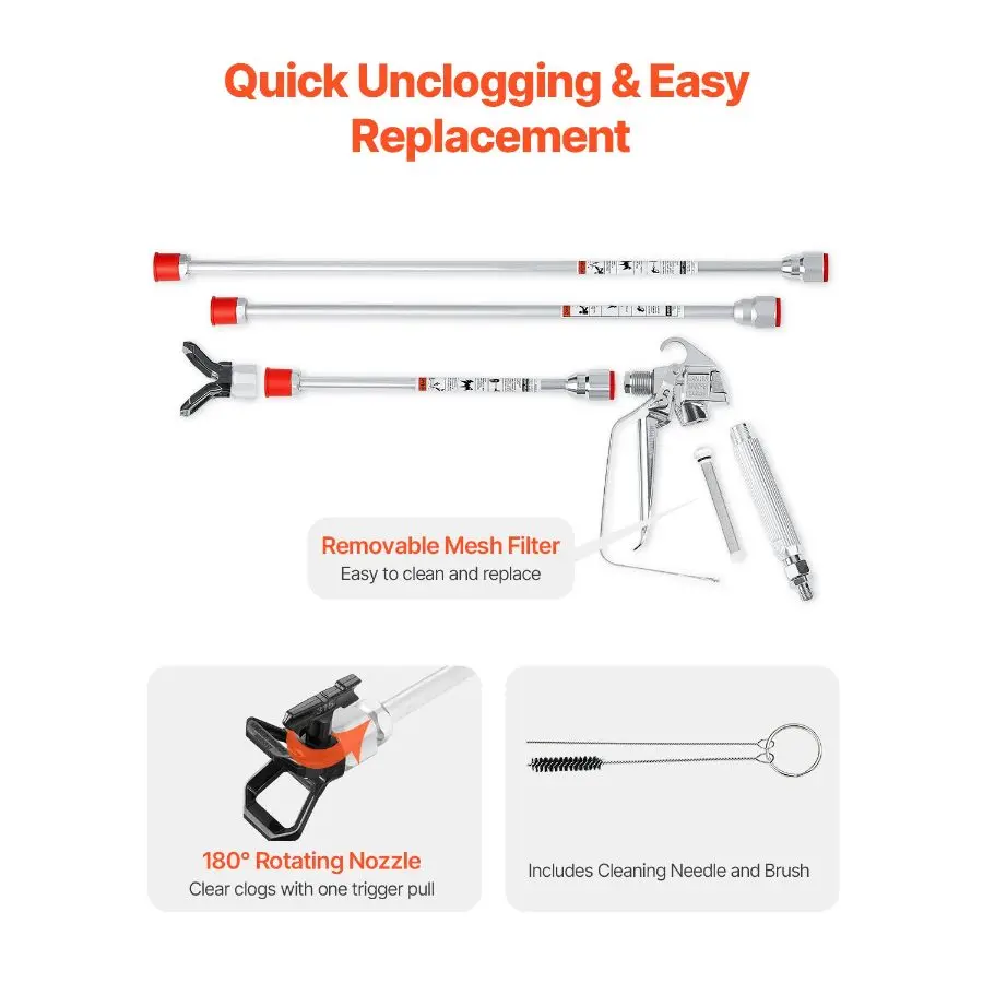 VEVOR Airless Paint Spray Gun, 3600PSI High Pressure Airless Paint Sprayer Gun with 5 Tips, 211, 315, 417, 517, 623, Swivel Joint Airless Spray Gun Kit with Filters, Cleaning Needle and BrushVEVOR Airless Paint Spray Gun and Hose Kit, 3600PSI High Pressure Paint Sprayer Hose Set with 5 Tips, 211, 315, 417, 517, 623, Swivel Joint Airless Spray Gun Kit with Filters, Hose and Extension Rods Efficient Spraying Extend Equipment Lifespan Quick Installation Versatile