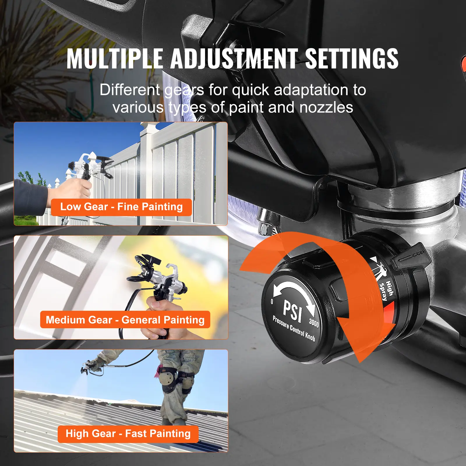 • Infinite Speed Control: You can adjust the speed of the electric paint sprayer according to different painting scenarios, material types, and thickness requirements. When covering large areas, you can use the low gear to reduce paint consumption and lower costs.