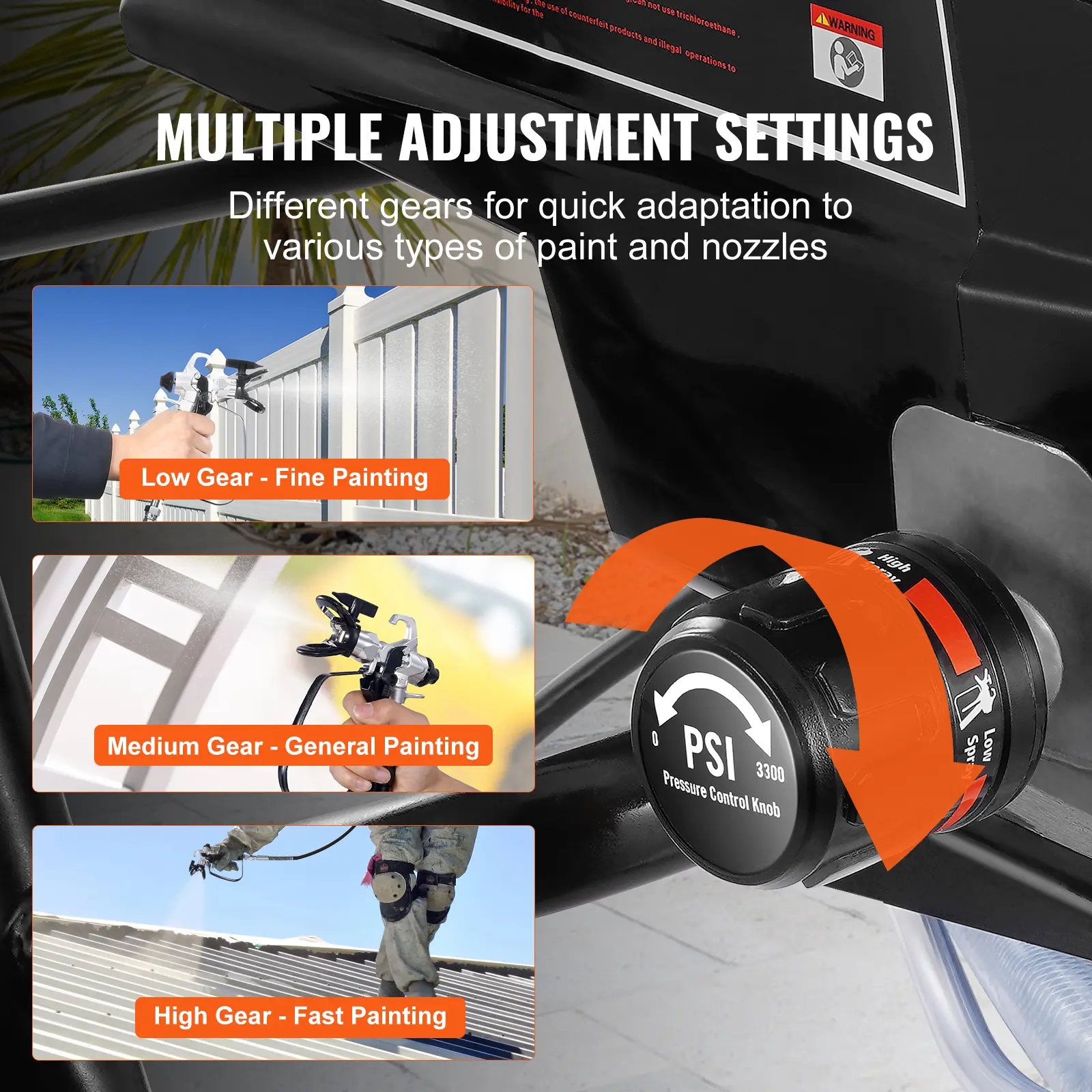 • Infinite Speed Control: You can adjust the speed of the electric paint sprayer according to different painting scenarios, material types, and thickness requirements. When covering large areas, you can use the low gear to reduce paint consumption and lower costs.