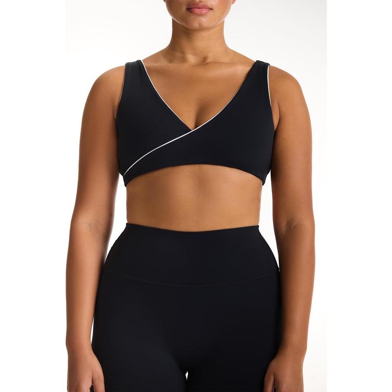 Introducing the NEW AirLuxe™ Breathe Contrast Wrap Bra, designed with our weightless and breathable technical fabric for medium compression and support. It features a medium support level, V-front neckline wrapping left to right, contrast piping at the front/back neckline, and a scoop back.