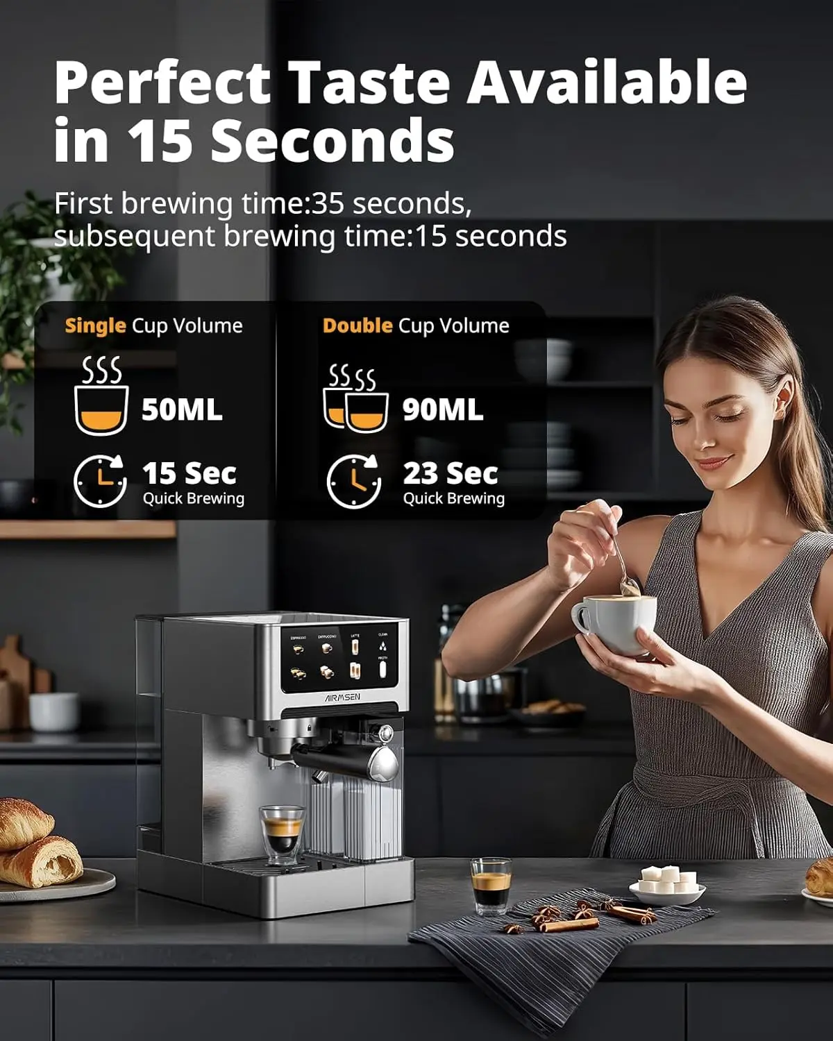 ·Customizable Brewing ExperienceTailor your coffee to your taste with adjustable settings for both coffee and milk froth volume. Whether it's an Americano, Macchiato, or Cappuccino, the AIRMSEN espresso coffee maker remembers your preferences for the perfect cup every time. Enjoy barista-quality drinks at home, just the way you like them.