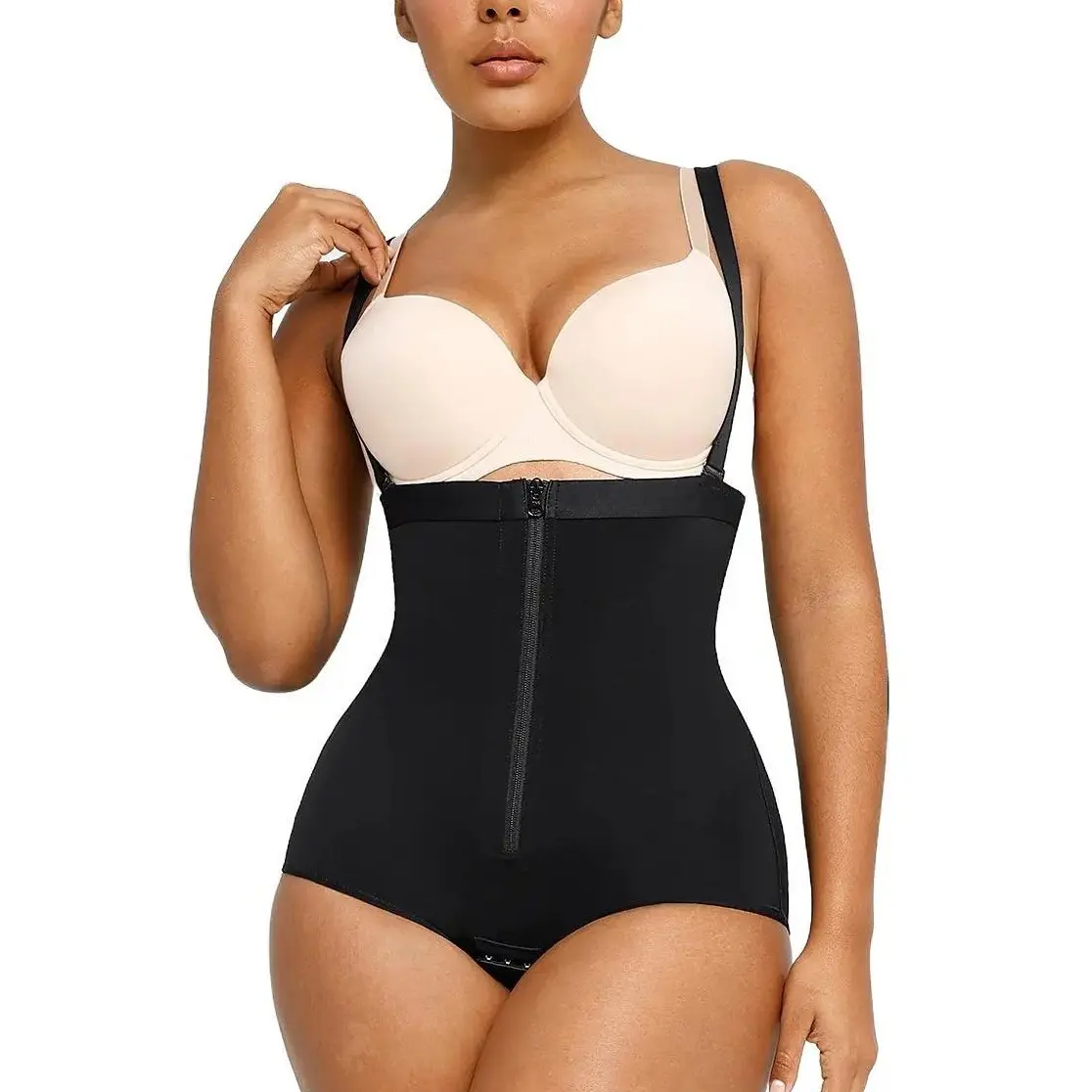 Why you'll love it! • Detachable and adjustable straps • It is boned with one steel bone on each side of the waist to prevent curling. • It increases fabric amount with hip wrinkles design, which can lift the butt. • It is easy to wear and take off with an eye-and-hook closure design inside and central front YKK zipper outside which is invisible under clothing. • It is three-layered at the abdomen to strengthen the abdomen control. • It has an eye-and-hook closure crotch design to provide a discrete opening between the legs for ease of use when using the restroom. • Elastic ribbon waistband design which is comfortable and not tight.