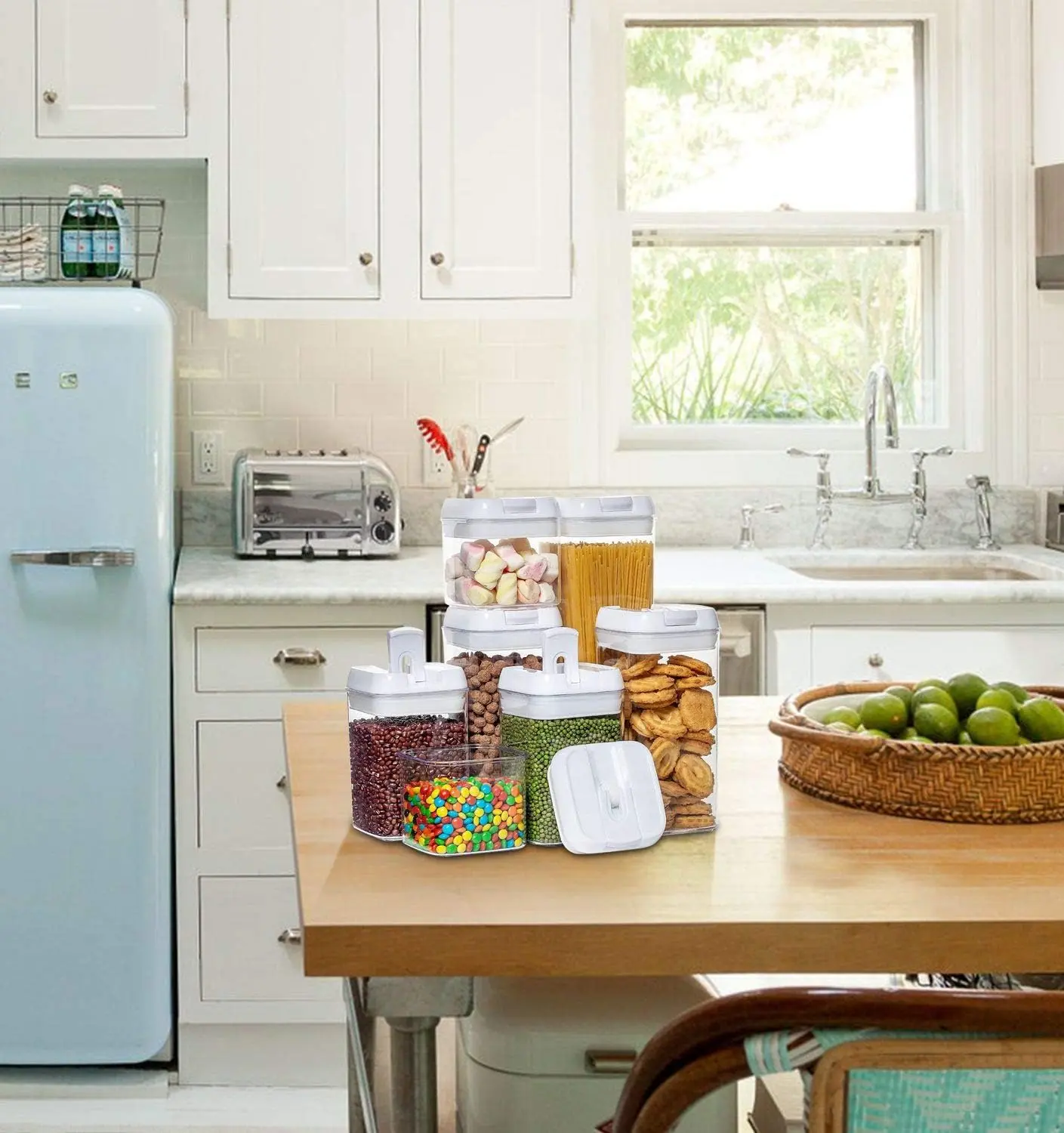 This set includes a variety of sizes to suit your storage needs: one tall container (1.9 liters), two medium containers (1.2 liters), two small containers (0.8 liters), and two mini containers (0.5 liters). This comprehensive range allows you to store a wide variety of solid foods, such as flour, grains, beans, nuts, sugar, snacks, noodles, coffee beans, and tea. They are also suitable for liquids like water, beverages, and soups.