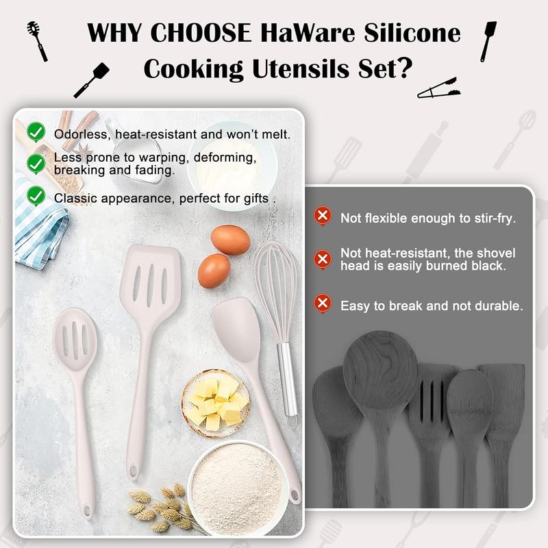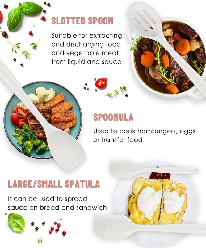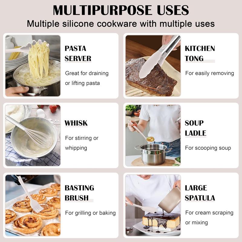 ·This 22-piece silicone cooking utensil set includes every tool you need for effortless cooking:Ladle | Pasta Fork | Spoonula | Slotted SpoonKitchen Tongs | Slotted Turner | Whisk | Basting Brush2 Spatulas (Large + Small) | Egg Separator | Utensil HolderMeasuring Spoons & Cups – Perfect for precise recipes!