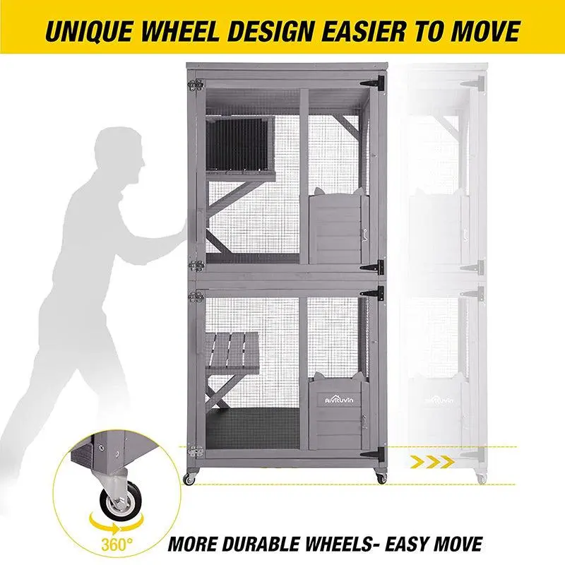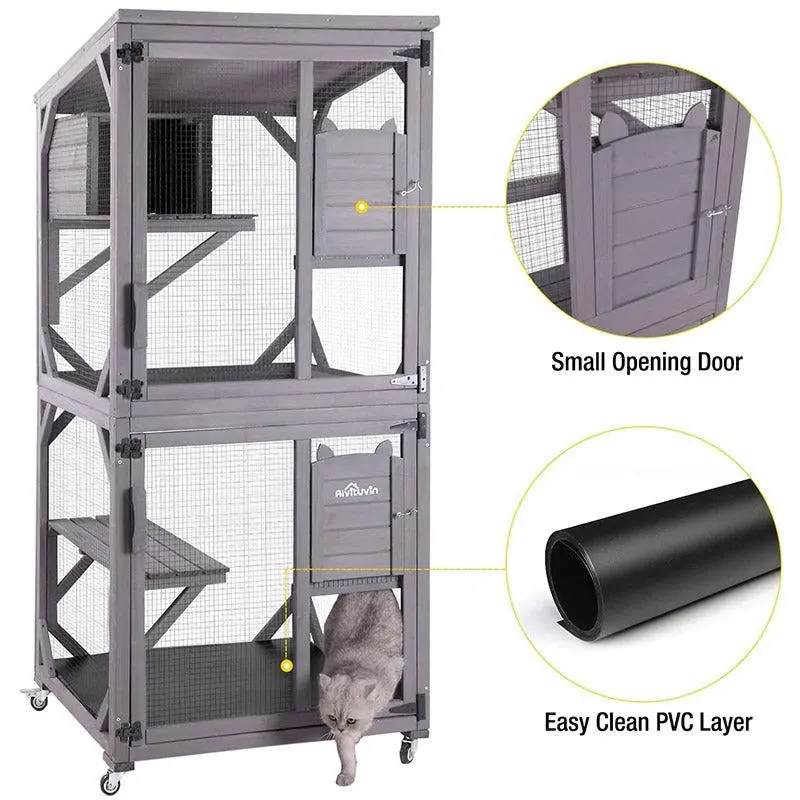 ·Cat house are with wooden bottom floor which is covered with a removable bottom PVC layer for easy cleaning. 2 big front doors and 2 small pulled up access doors with hook for easy catching you pets.