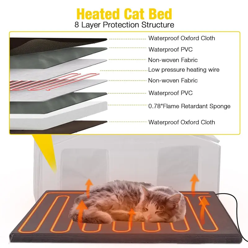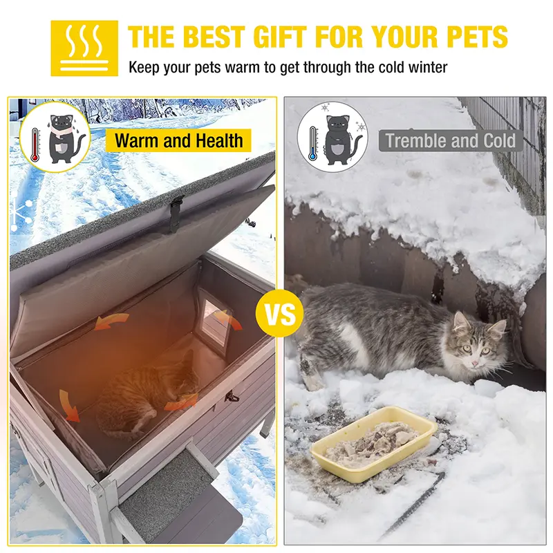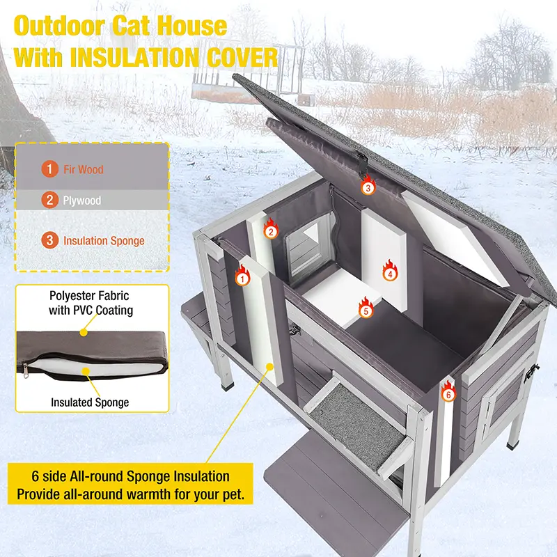 Insulated Design Construction-This cat house with 6 sides all-around insulated construction to ensure superior warmth. Crafted with 3-layer insulated materials (solid wood+plywood+ liner). Your cats will stay warm in winter and cool in summer, making it a haven they'll appreciate year-round.