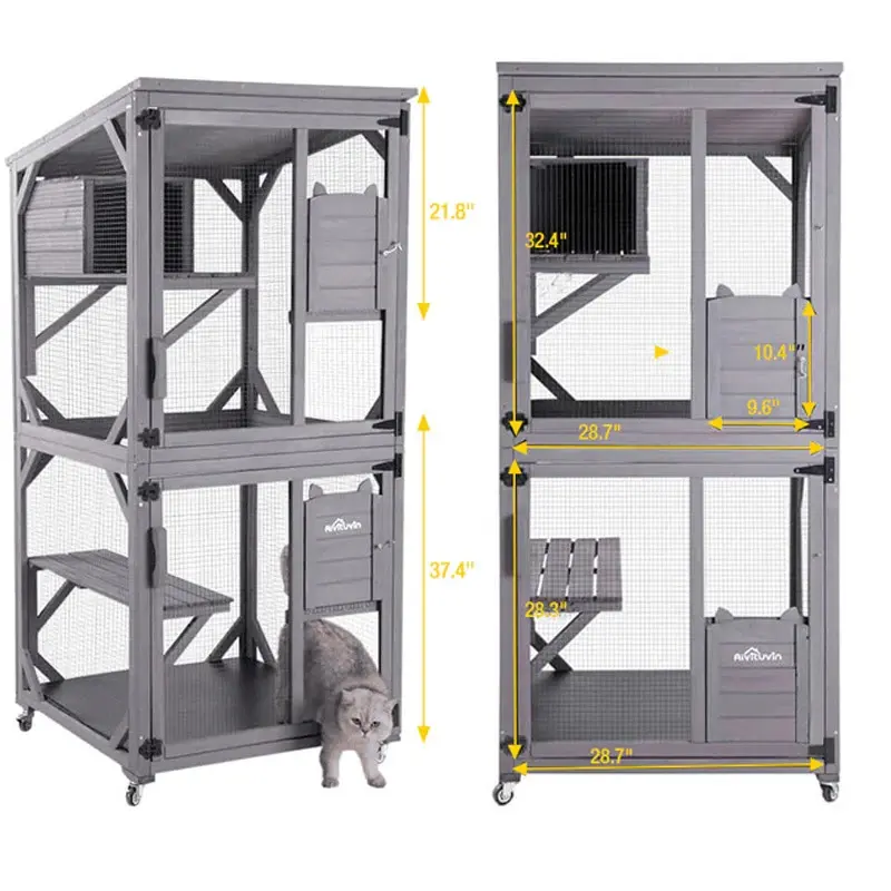 ·Cat house are with wooden bottom floor which is covered with a removable bottom PVC layer for easy cleaning. 2 big front doors and 2 small pulled up access doors with hook for easy catching you pets.