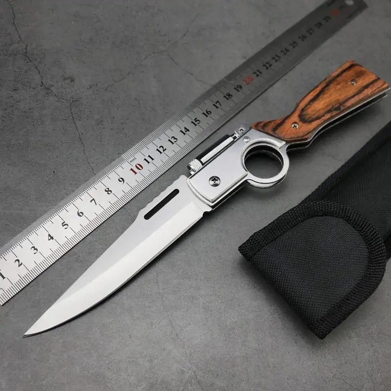 It is spring loaded with a button on the side and a "trigger lock" to prevent it from popping open. The flashlight is pretty bright. Considering another one for me